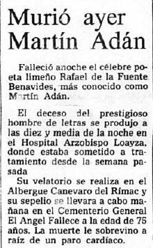 Nos dejó cuando Lima estaba a 48 horas de recibir al papa Juan Pablo II. Lima no pensaba en poesía sino en religión, en devoción papal. La portada de El Comercio del día siguiente, 30 de enero de 1985, en medio de noticias del mundo y banderas del Vaticano en las esquinas limeñas, daba cuenta del lamentable suceso con una parquedad asombrosa. “Murió ayer Martín Adán”, decía secamente el titular de la breve nota.
