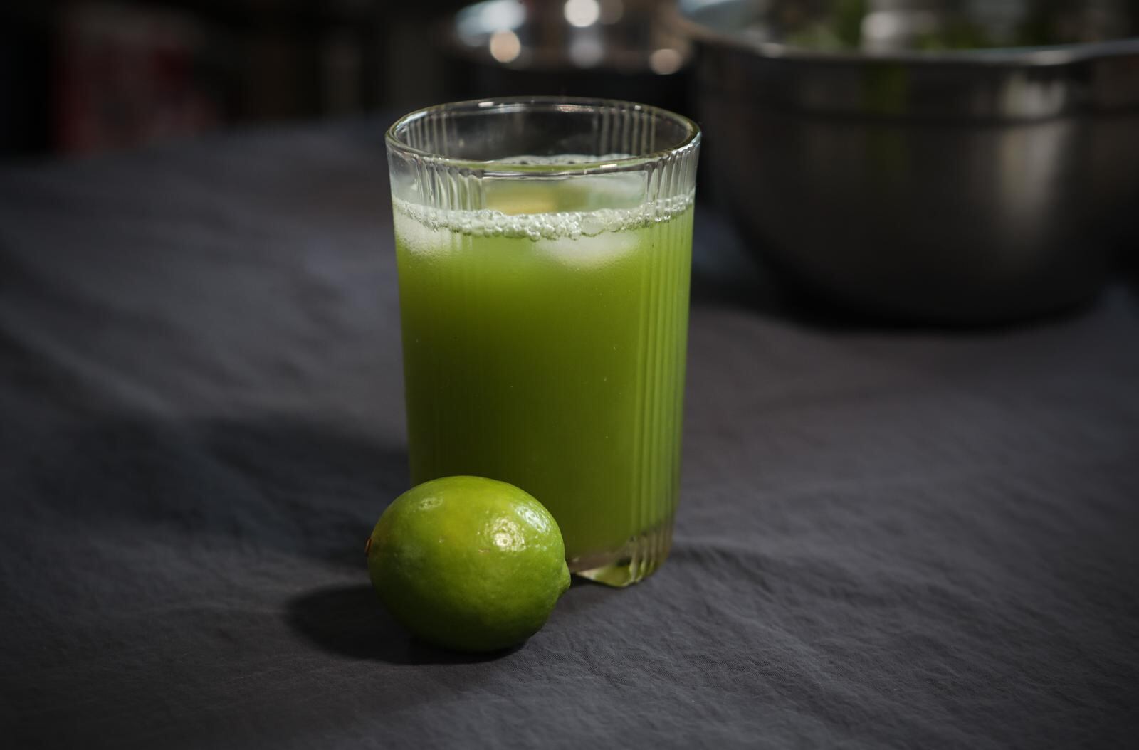 - En una licuadora, colocar agua, hielo, zumo de limón, hojas de apio y azúcar.