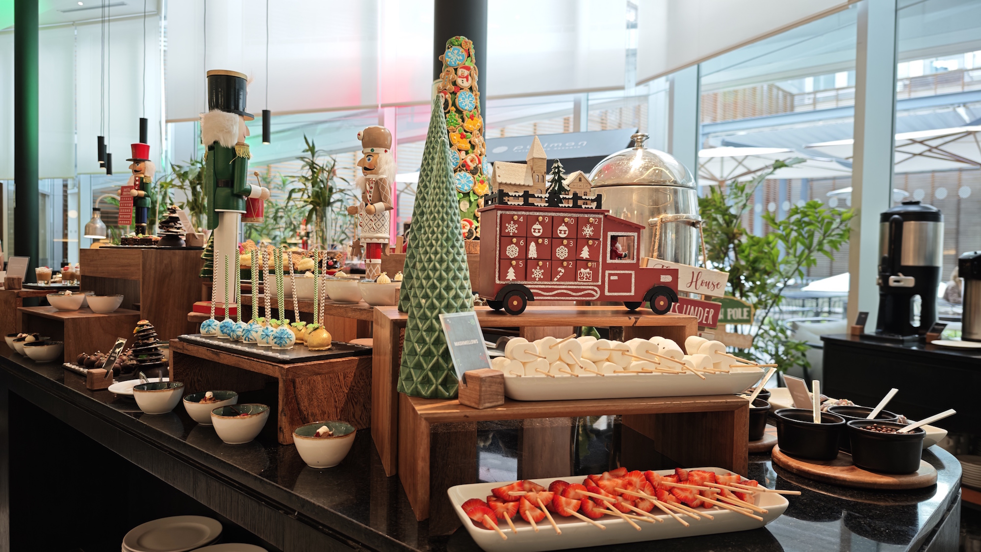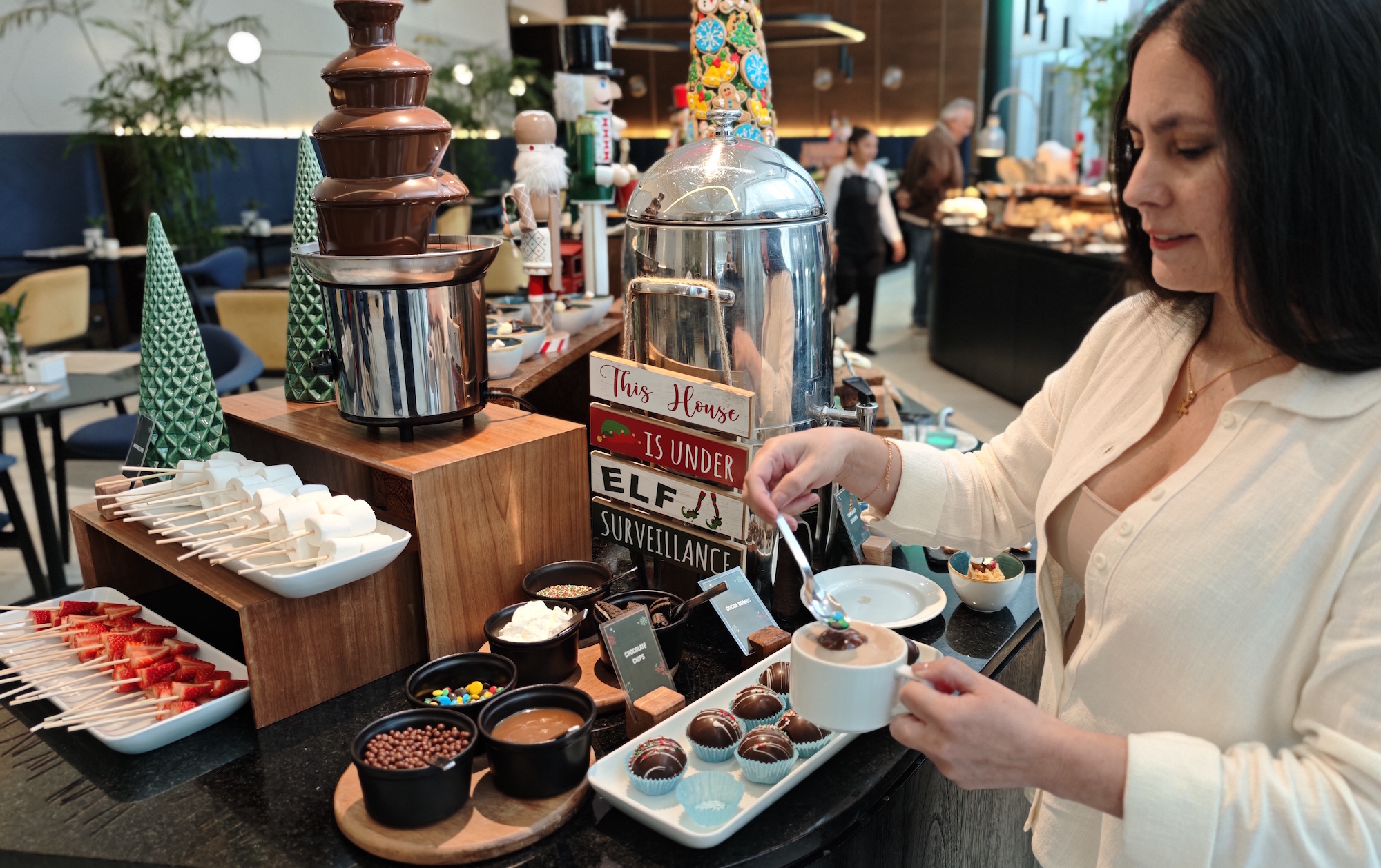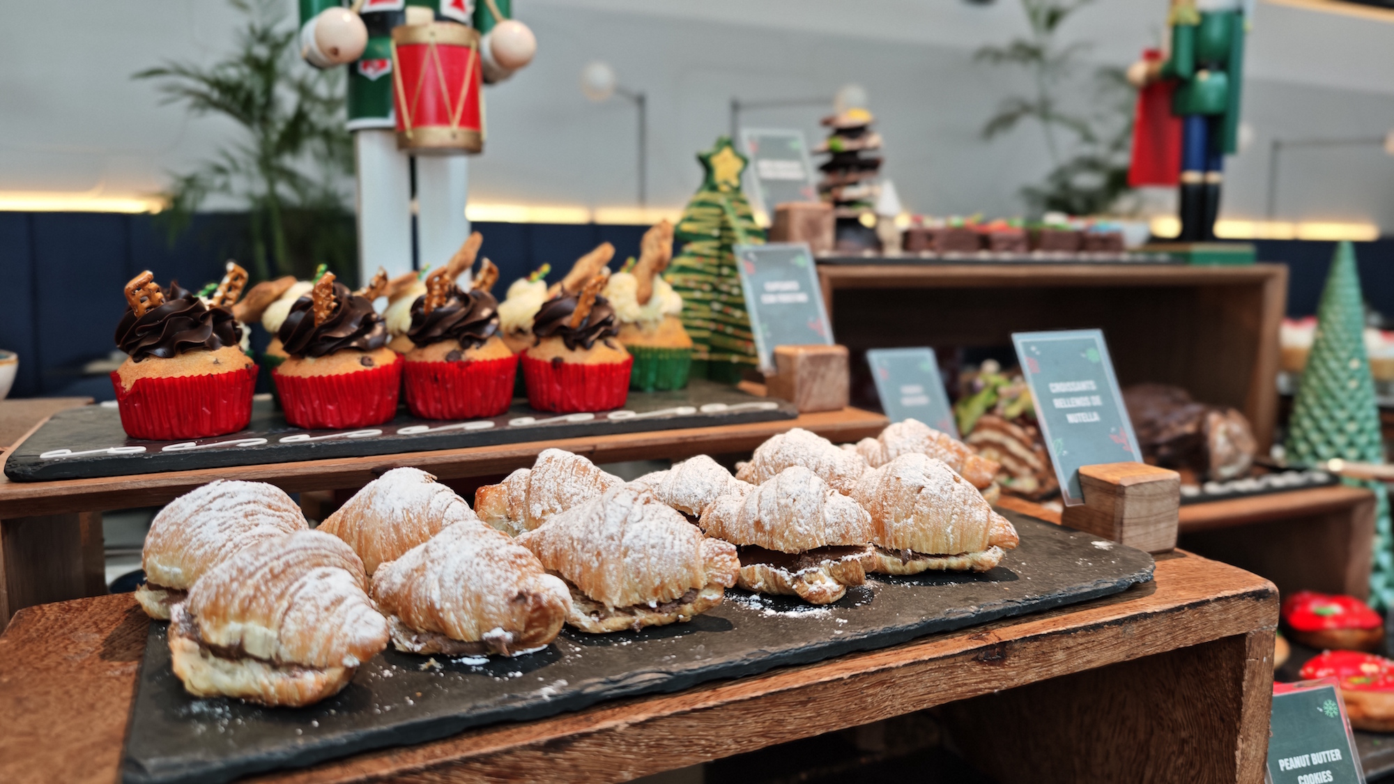 Como es Navidad no puede faltar el panetón. Una delicia hecha con masa madre y chispas de chocolate que nos cautiva desde el primer bocado. El placer continuó cuando probamos los cupcakes con forma de reno, con Nutella y trozos de pretzel como cuernos. Seguimos con el mousse de chocolate, los mini suspiros a la limeña, los croissants de Nutella y los marshmallows bañados en chocolate en la fuente de fondue. Todo está para chuparse los dedos.