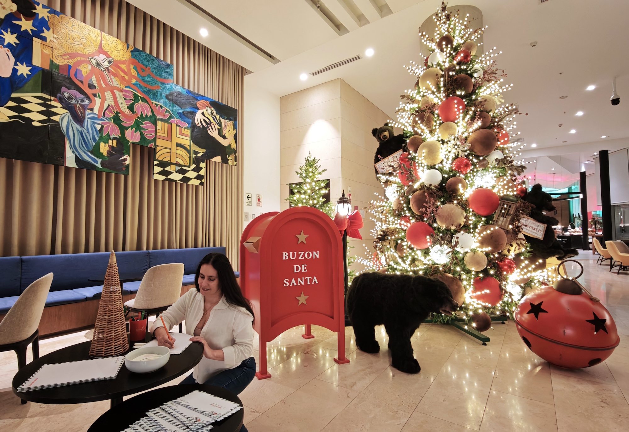 Desde que uno ingresa al hotel se siente el espíritu navideño. Un enorme árbol decorado nos da la bienvenida. Con esferas en rojo y tonos tierra y tiernos osos de peluche que cuelgan de sus ramas. Al costado, un gran buzón nos invita a enviarle cartas a Papá Noel. Podemos escribirlas ahí mismo, con los papeles, sobres y colores que la marca ha destinado para esta experiencia.