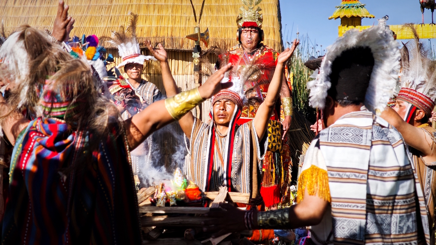 Los pututeros marcaron el inicio de este primer acto encabezado por la pareja mítica. Músicos ingresaron por los cuatro suyos y los sacerdotes ofrecieron hojas de coca, maíz y la tradicional chicha de jora para agradecer a la madre agua. Posteriormente se colocaron papas, chochoca, trucha y otros productos andinos en una manta sobre el junco de la isla para compartir entre los asistentes.