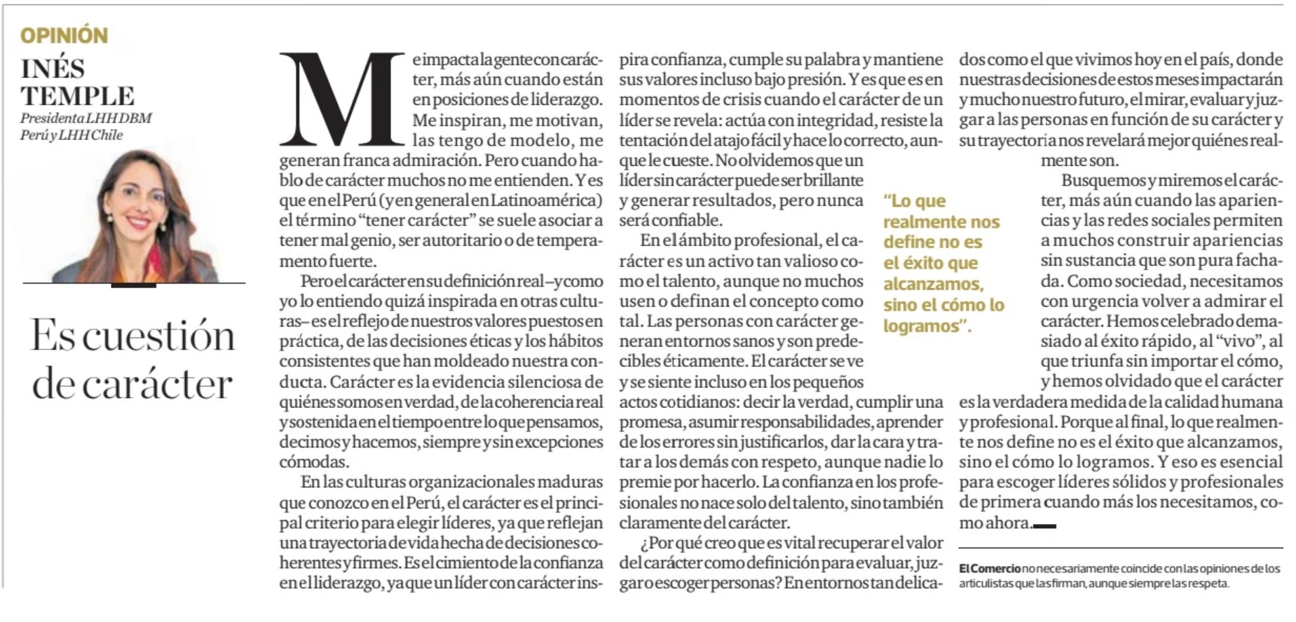 “Al final, lo que realmente nos define no es el éxito que alcanzamos, sino el carácter con el que lo logramos. Y eso es esencial para escoger líderes sólidos y profesionales de primera cuando más los necesitamos, como ahora”