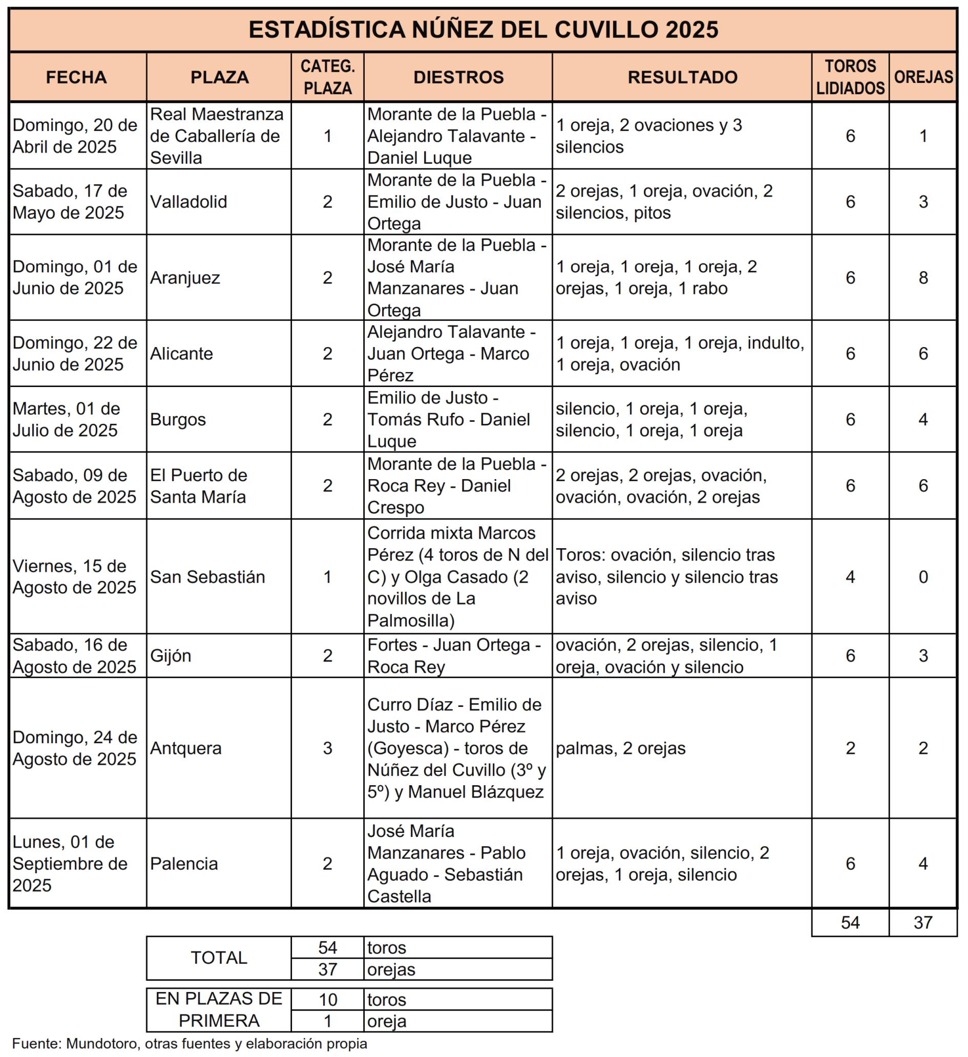 Domingo Hernández ha lidiado, este año, 69 toros; se les cortó 50 orejas; en plazas de primera lidiaron 20 astados que permitieron la obtención de 9 orejas. Cuvillo lidió, en 2025, 54 toros a los que se les cortó 37 orejas y hubo uno indultado en Alicante; en plazas de primera presentó 10 astados que posibilitaron una oreja. Debajo, la estadística detallada.