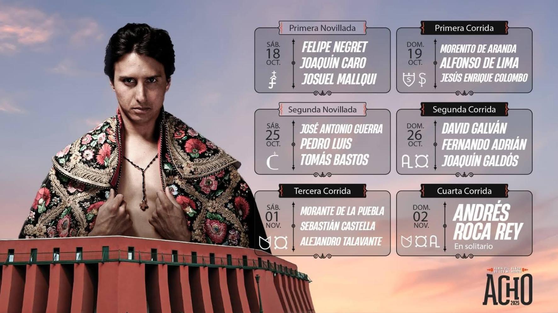 Encabeza el cartel Andrés Roca Rey, la primera figura del toreo, que lidiará seis toros en solitario la última tarde, para celebrar sus 10 años de alternativa; aniversario que se cumplió el pasado 19 de septiembre.