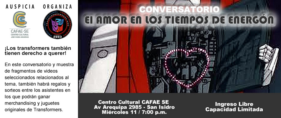 Este 11 de Febrero a las 7pm será el primer evento del año de Transformers Perú. Estaremos en Cafae de la Av. Arequipa (Av. Arequipa 2985 a un par de cuadras de la Av. Javier Prado) con un conversatorio por el mes del amor: