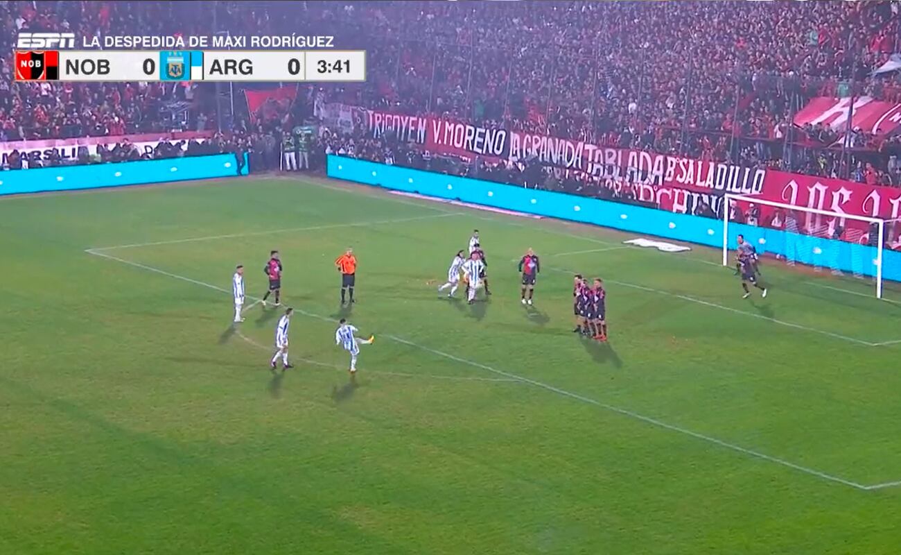 Lionel Messi asistió al partido de despedida de ‘Maxi’ Rodríguez y demoró solo cuatro minutos en hacer estallar todo el estadio Marcelo Alberto Bielsa. De tiro libre, ‘La Pulga’ colocó el balón donde se impregnan las telarañas. Mira el golazo a continuación.