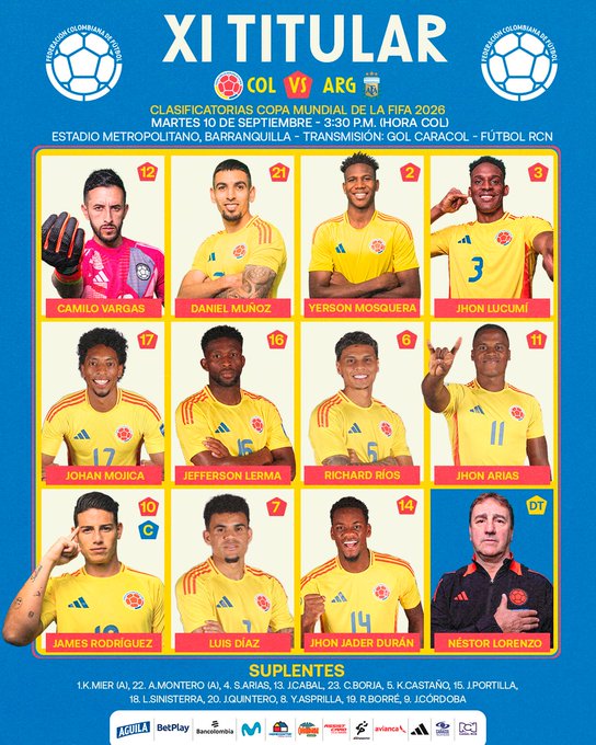 Alineaciones de Colombia vs. Argentina
