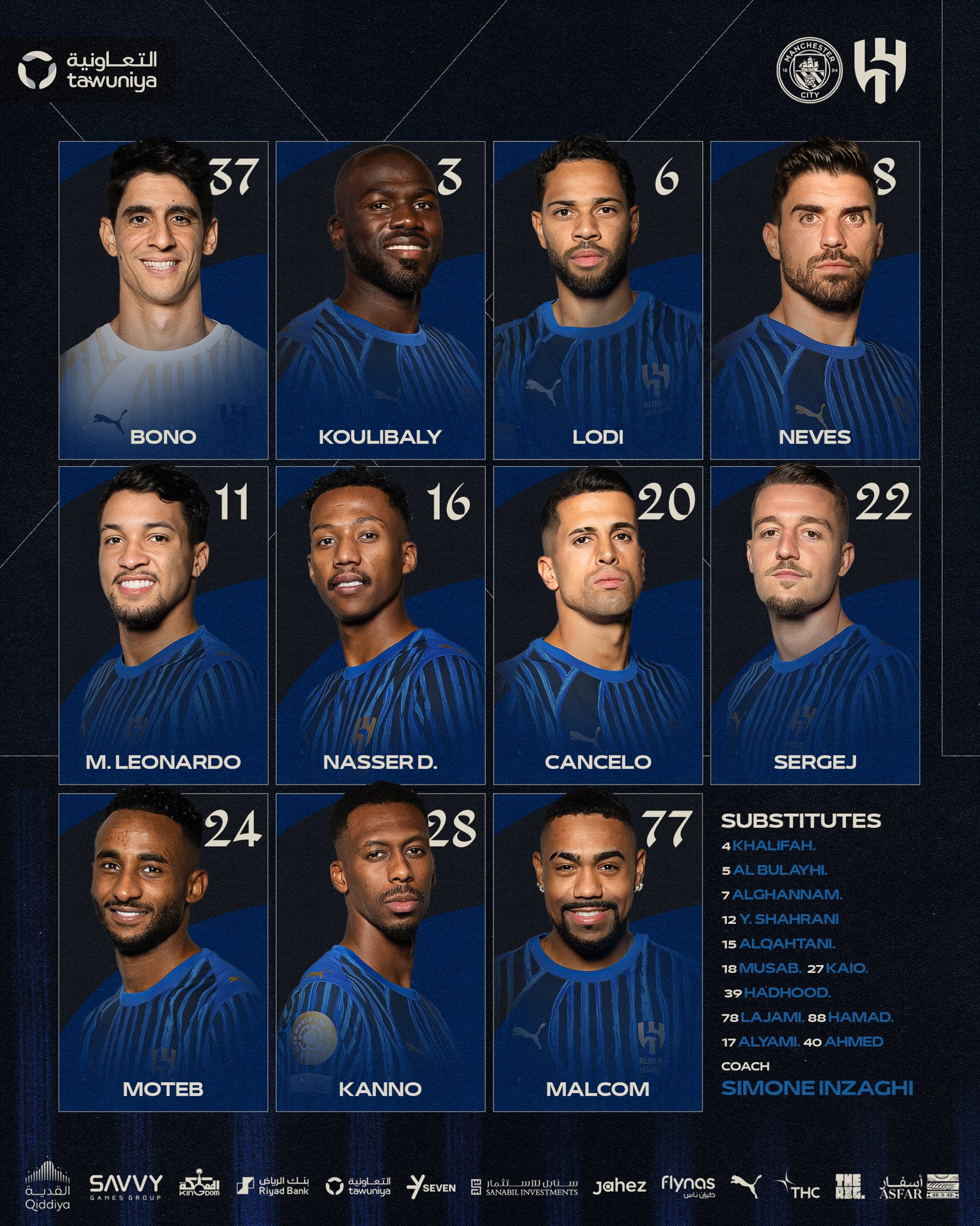 Yassine Bounou; Renan Lodi, Kalidou Koulibaly, Hassan Al Tambakti, João Cancelo; Nasser Aldawsari, Ruben Neves, Sergej Milinković-Savić; Malcom, Salem Al Dawsari, Marcos Leonardo.