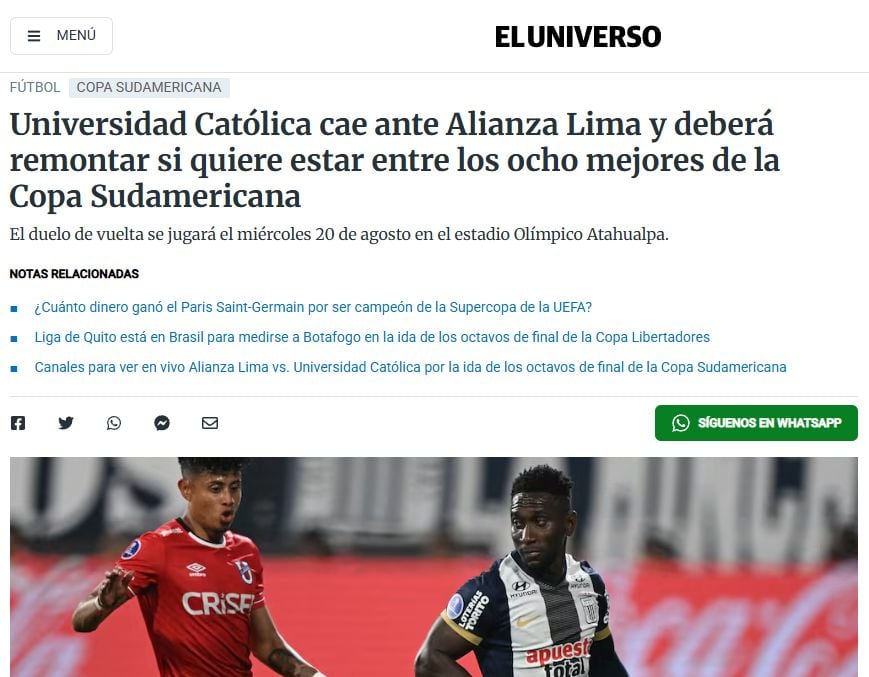 El duelo de vuelta se jugará en Quito el próximo miércoles 20 de agosto desde las 7:30 p.m. (hora peruana).