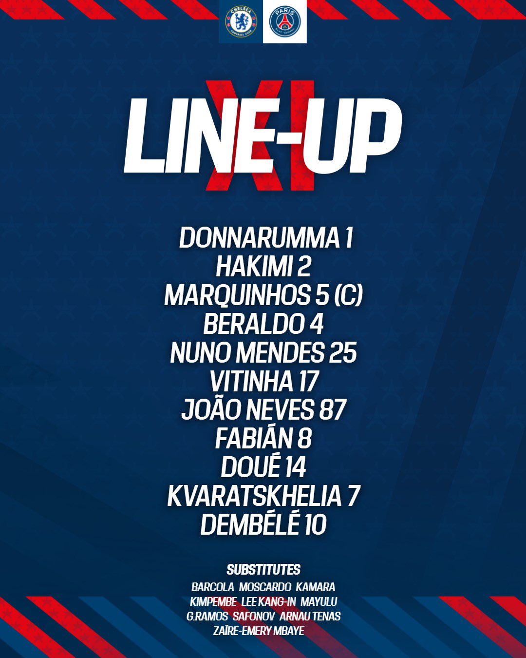 - PSG: Gianluigi Donnarumma, Achraf Hakimi, Marquinhos, Lucas Beraldo, Nuno Mendes, Joao Neves, Fabian Ruiz, Vitinha, Desire Doue, Ousmane Dembele, Khvicha Kvaratskhelia.