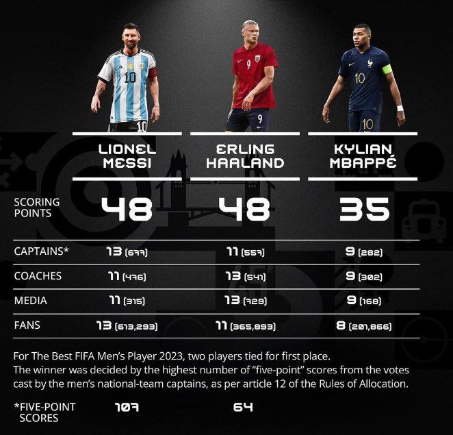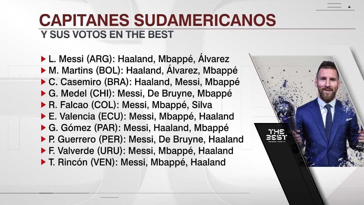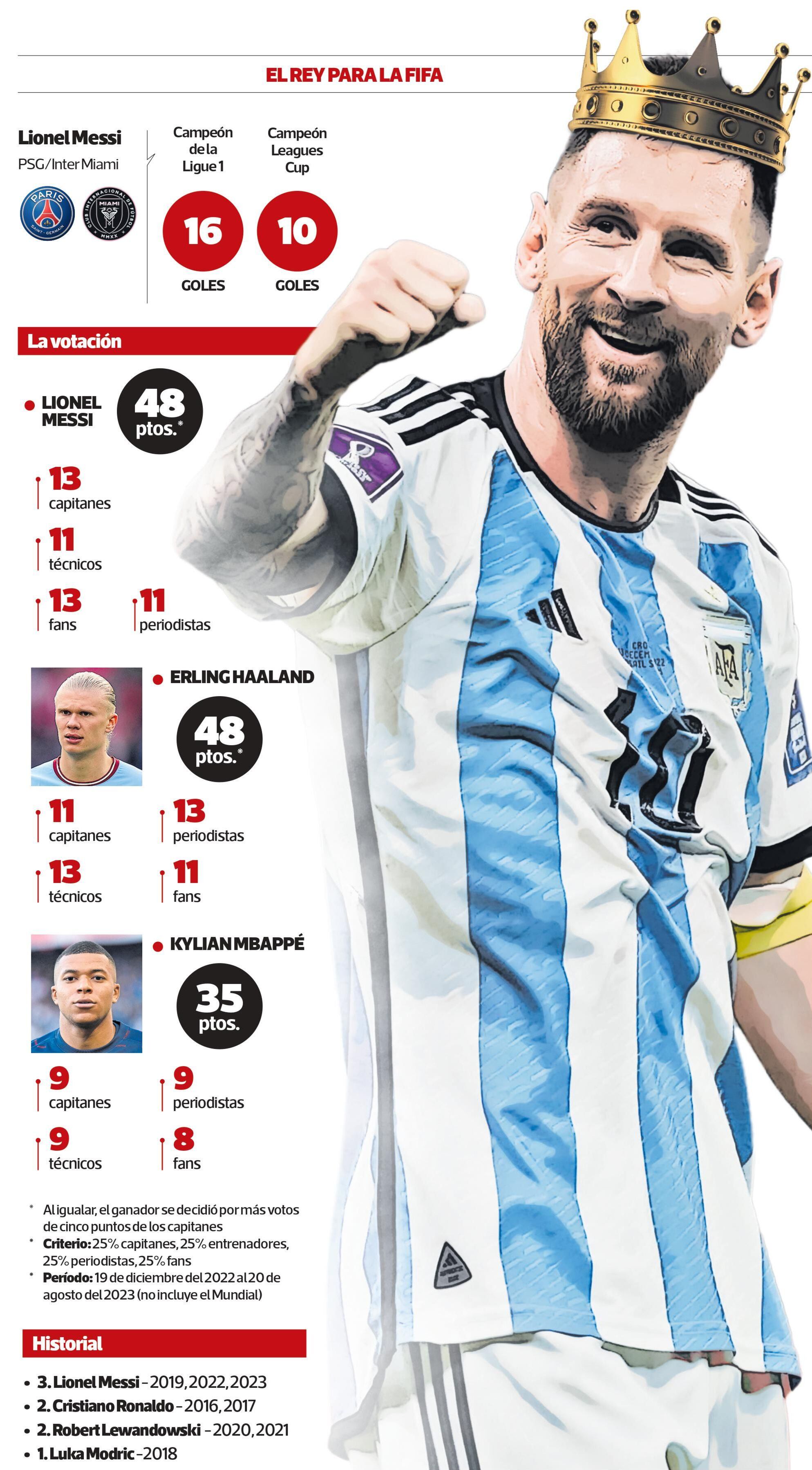 Así, la votación quedó empatada entre Leo y Erling, pero finalmente el premio fue para el argentino porque el reglamento dicta que gana quien más veces fue elegido como 1° por los capitanes. Y ahí Messi recibió 107 votos frente a los 64 que se inclinaron por Haaland.