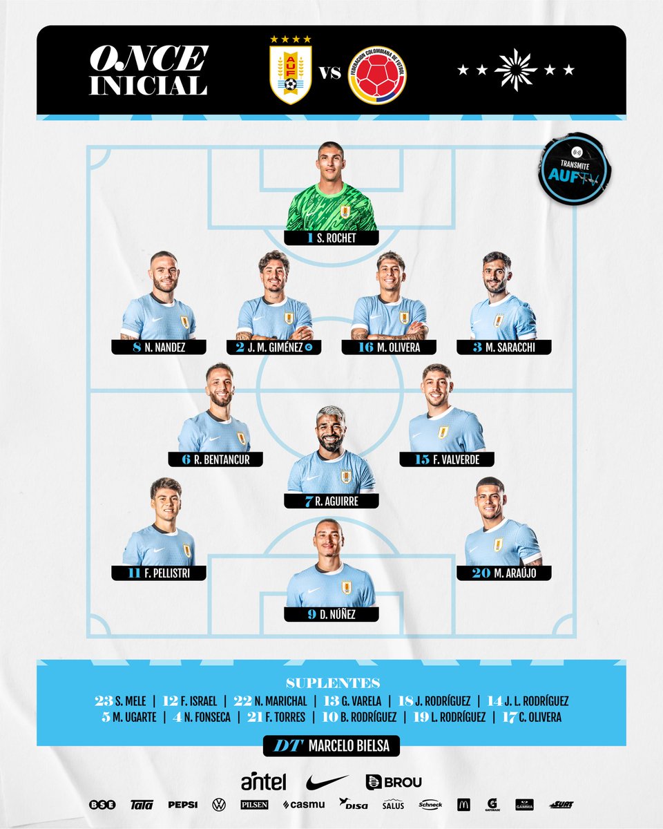 - Uruguay: Sergio Rochet; Guillermo Varela, Manuel Ugarte y Santiago Bueno; Nahitan Nández, Federico Valverde, Emiliano Martínez, Maximiliano Araújo, Giorgian De Arrascaeta; Christian Olivera y Darwin Núñez.