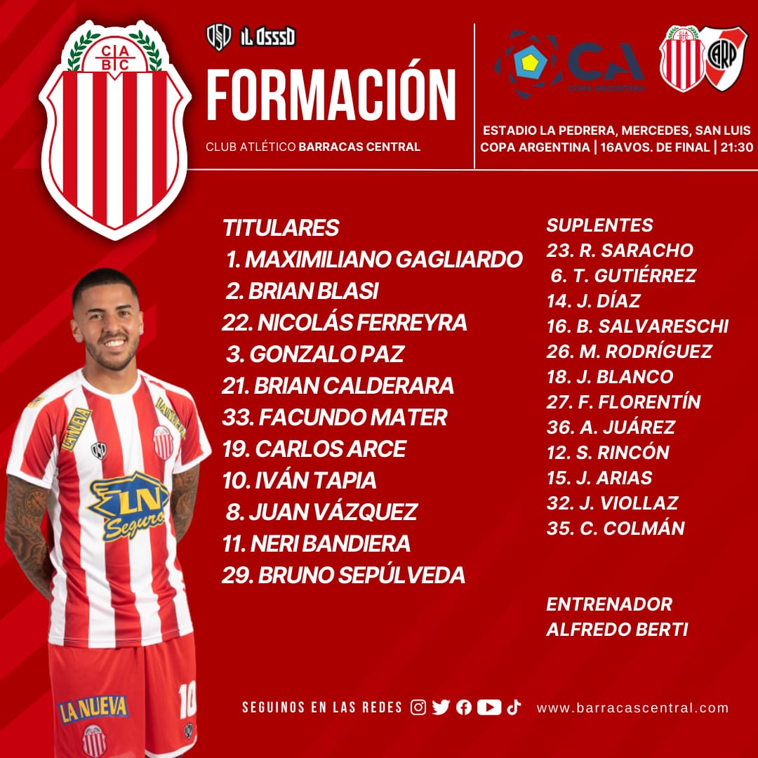 Barracas Central: Maximiliano Gagliardo; Brian Blasi, Brian Calderara, Nicolás Ferreyra, Gonzalo Paz, Carlos Arce, Facundo Mater, Iván Tapia, Juan Vázquez, Bruno Sepúlveda y Neri Bandiera.