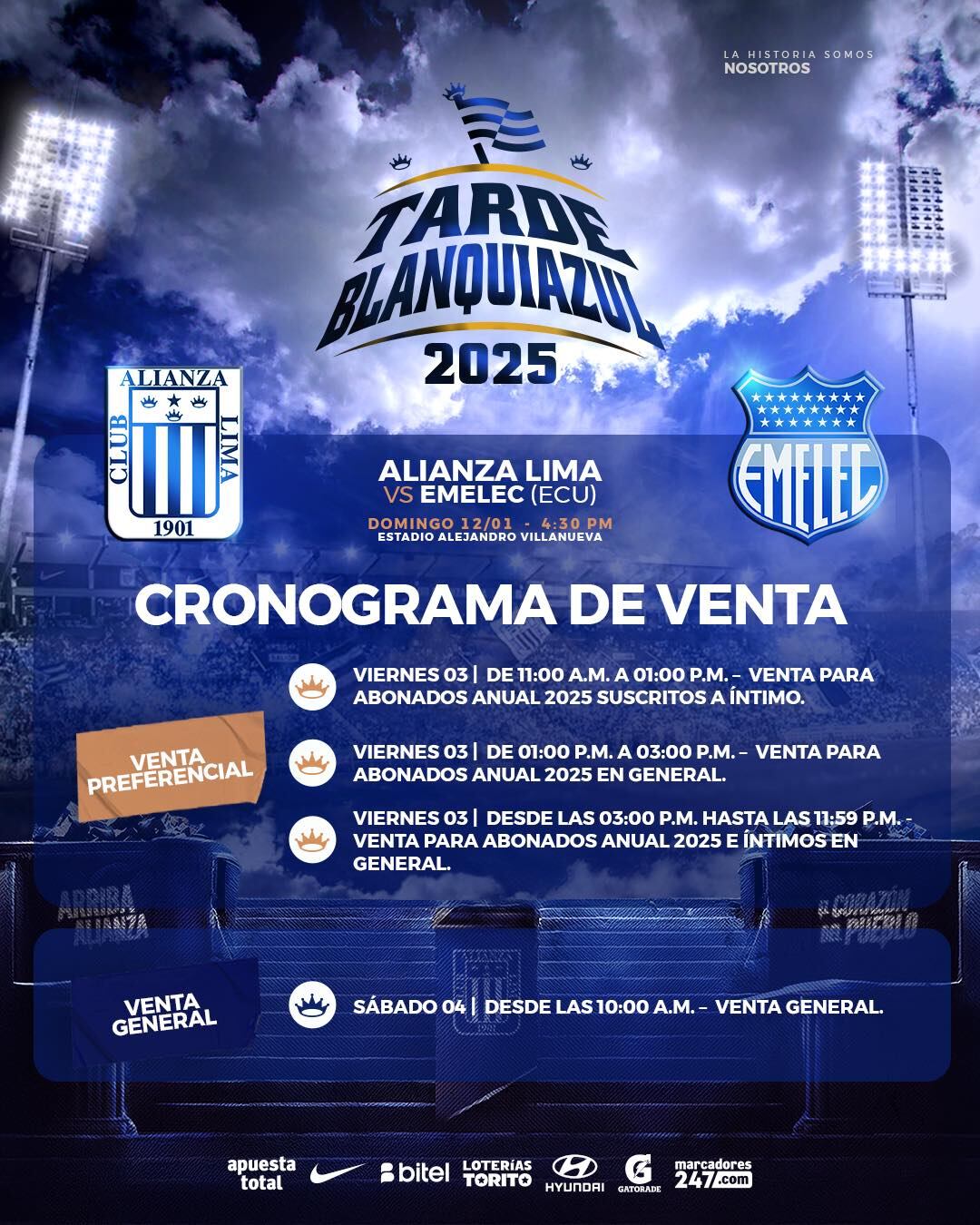 Alianza Lima comunicó que se ha iniciado la venta preferencial de entradas para la ‘Tarde Blanquiazul’ en la que presentará a su plantel profesional 2025, el mismo que competirá en la Liga 1 Te Apuesto y la Copa Libertadores.