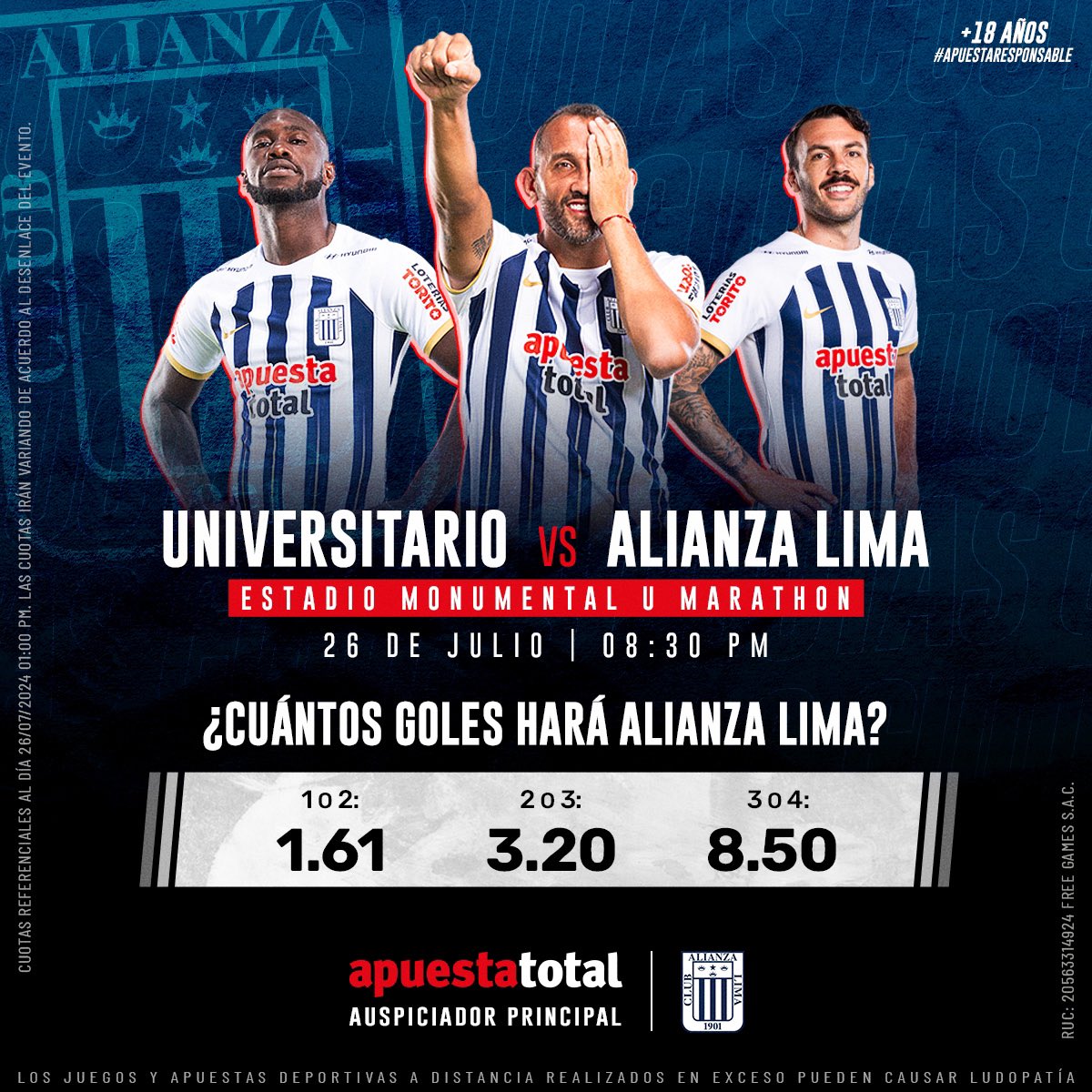 - Apuesta Total: Gana Universitario 2.05 | Gana Alianza Lima: 4.00 | Empate: 3.00