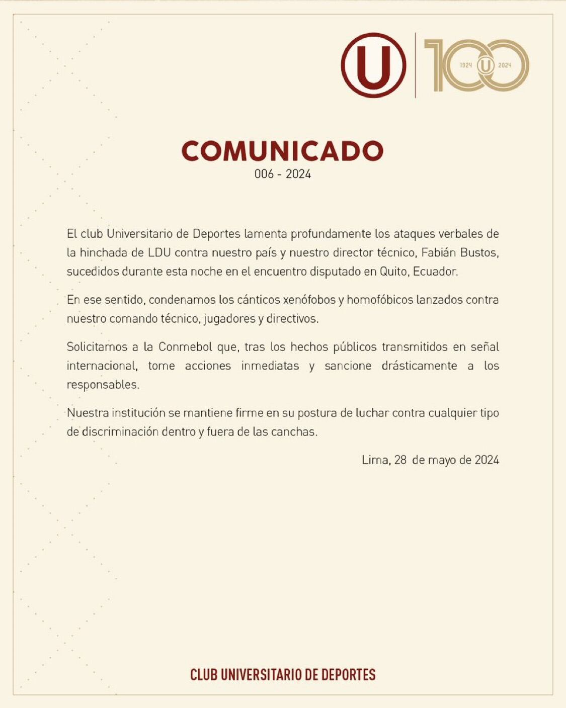 Post partido, el club crema emitió un comunicado denunciando insultos racistas y xenófobos a jugadores y cuerpo técnico de Fabián Bustos por parte de la hinchada ecuatoriana.