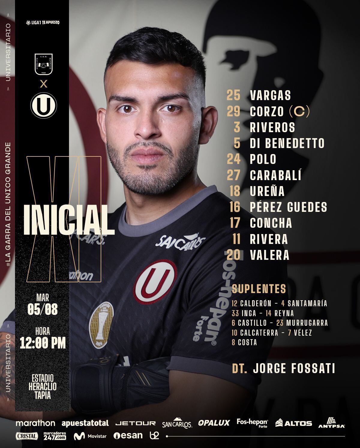 - Once de la U para hoy: Vargas, Corzo, Riveros, Di Benedetto, Polo, Carabalí, Ureña, Pérez Guedes, Concha, Rivera, Valera.