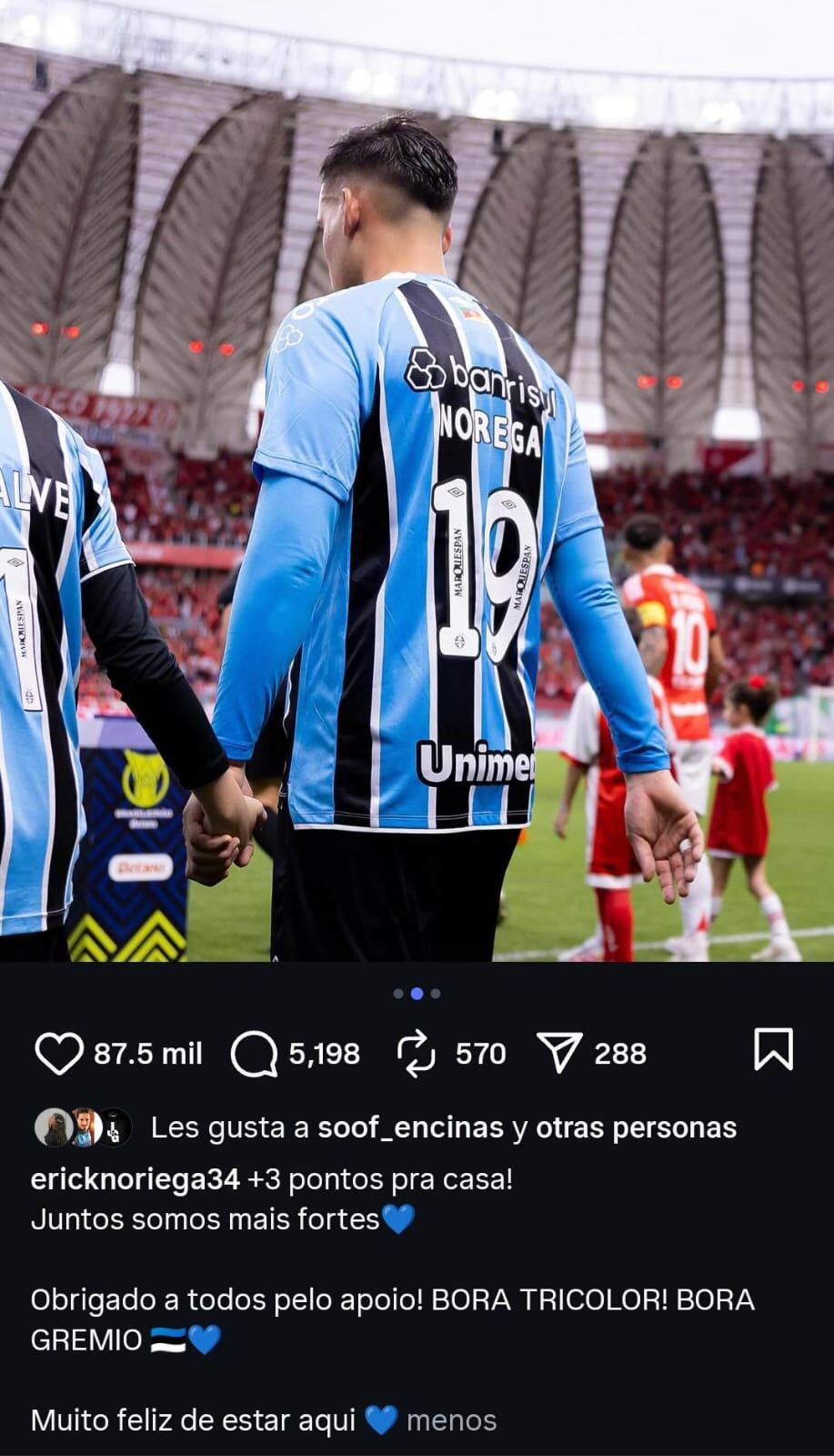 “¡+3 puntos para casa! ¡Juntos somos más fuertes! ¡Gracias a todos por su apoyo! ¡Vamos Tricolor! ¡Vamos Gremio! ¡Qué alegría estar aquí!”, escribió en su cuenta de Instagram.