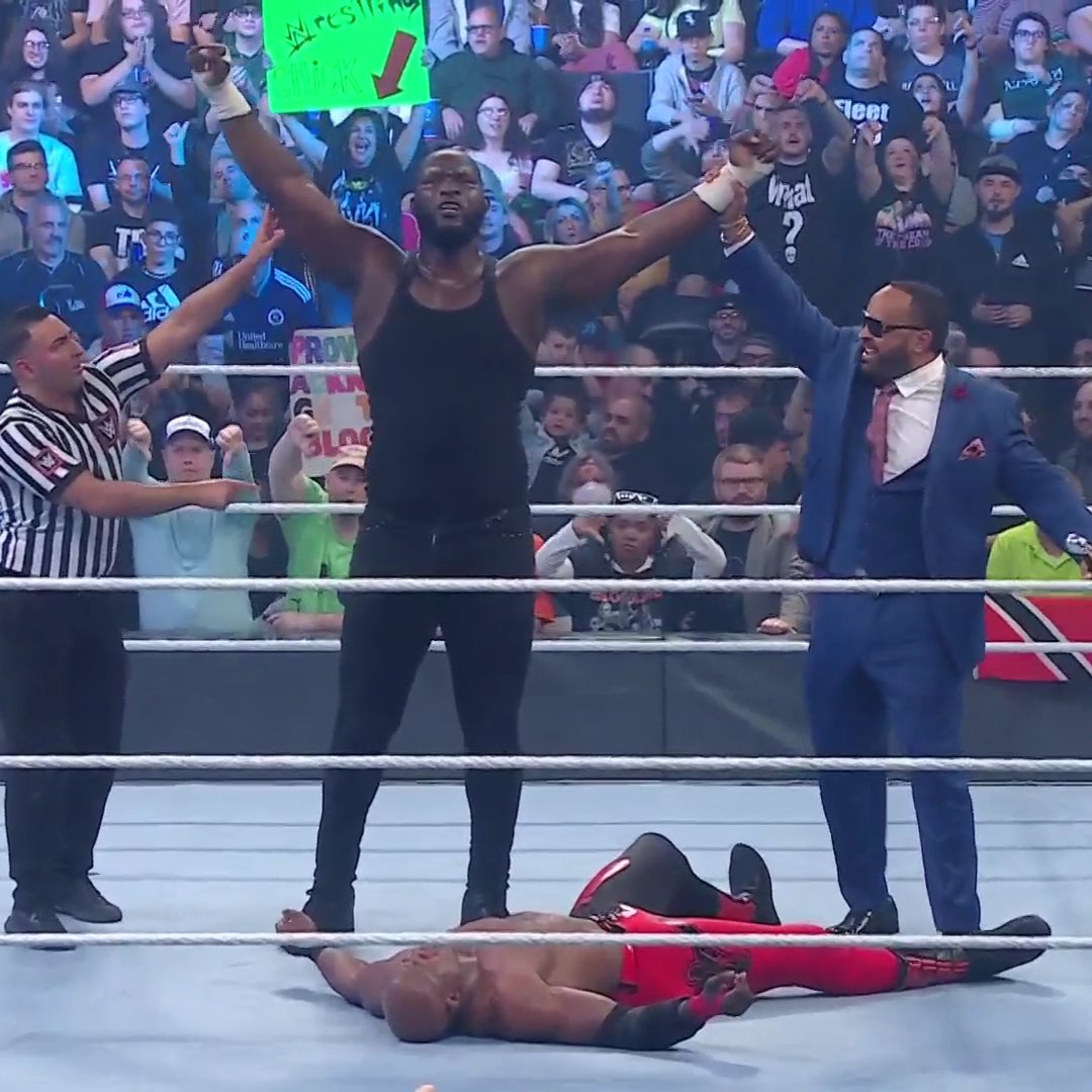 A pesar de la diferencia de peso y altura, Bobby Lashley se hace respetar ante Omos. MVP apareció y subió al ring.