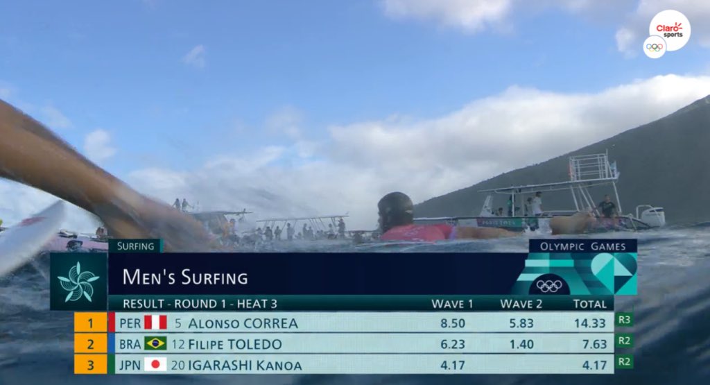 Alonso Correa quedó en el 1er lugar (14,33) en el Heat 3 superando a Filipe Toledo (BRA / 7,63) y a Kanoa Igarashi (JPN / 4,17). Avanza a siguiente etapa en #Paris2024
