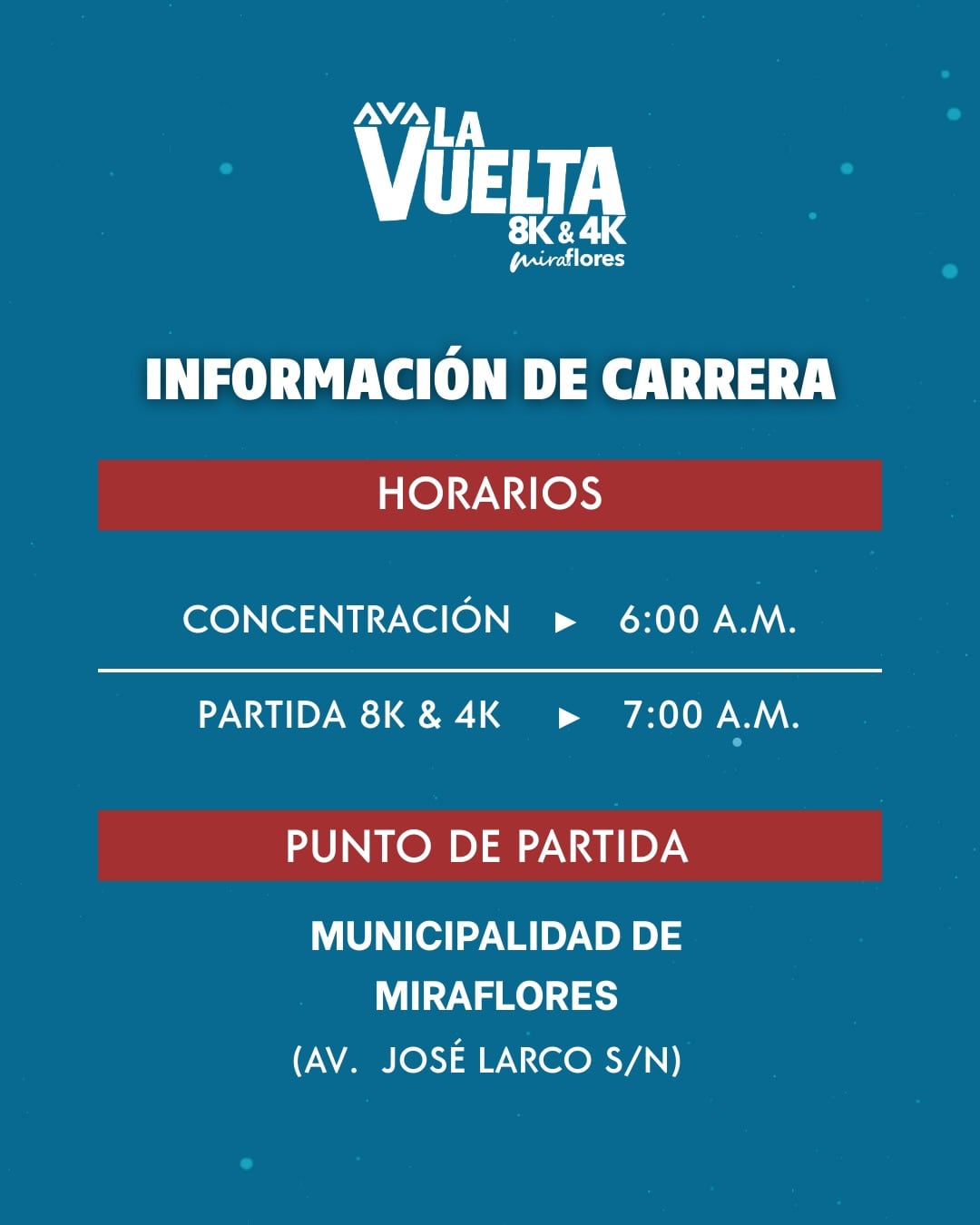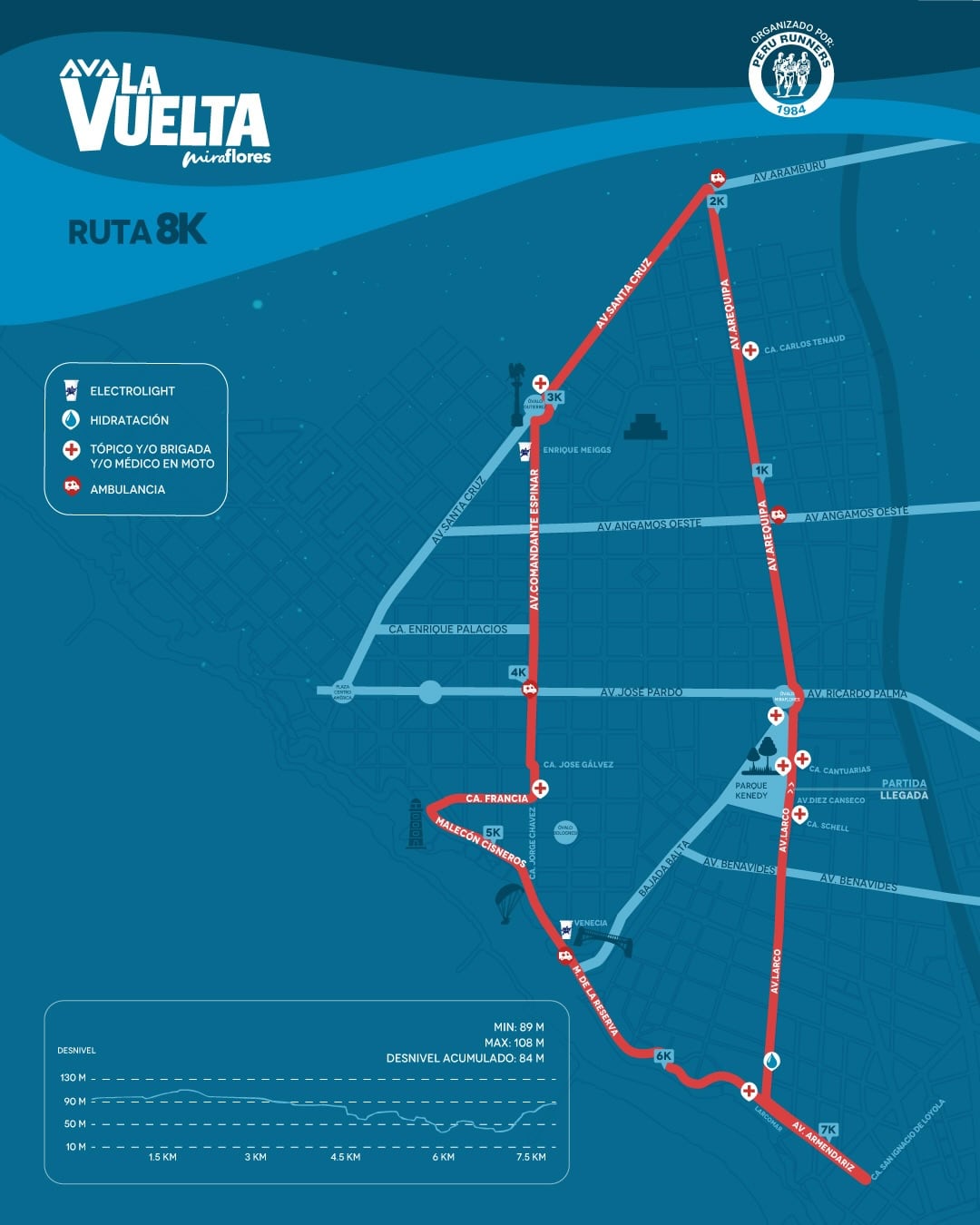 La concentración está pactada para las 6:00 a.m., y una hora más tarde (7:00 a.m.) será la partida de los 8k y 4k, desde la Municipalidad de Miraflores.