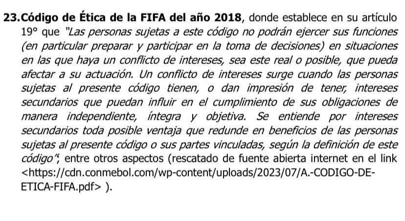 En el expediente se hace referencia al Código de Ética de la FIFA del año 2018, que en su artículo 19° señala que “las personas sujetas a este código no podrán ejercer sus funciones (en particular preparar y participar en la toma de decisiones) en situaciones en las que haya un conflicto de intereses, sea este real o posible, que pueda afectar a su actuación. Un conflicto de intereses surge cuando las personas sujetas al presente código tienen, o dan impresión de tener, intereses secundarios que puedan influir en el cumplimiento de sus obligaciones de manera independiente, íntegra y objetiva. Se entiende por intereses secundarios toda posible ventaja que redunde en beneficios de las personas sujetas al presente código o sus partes vinculadas, según la definición de este código”.