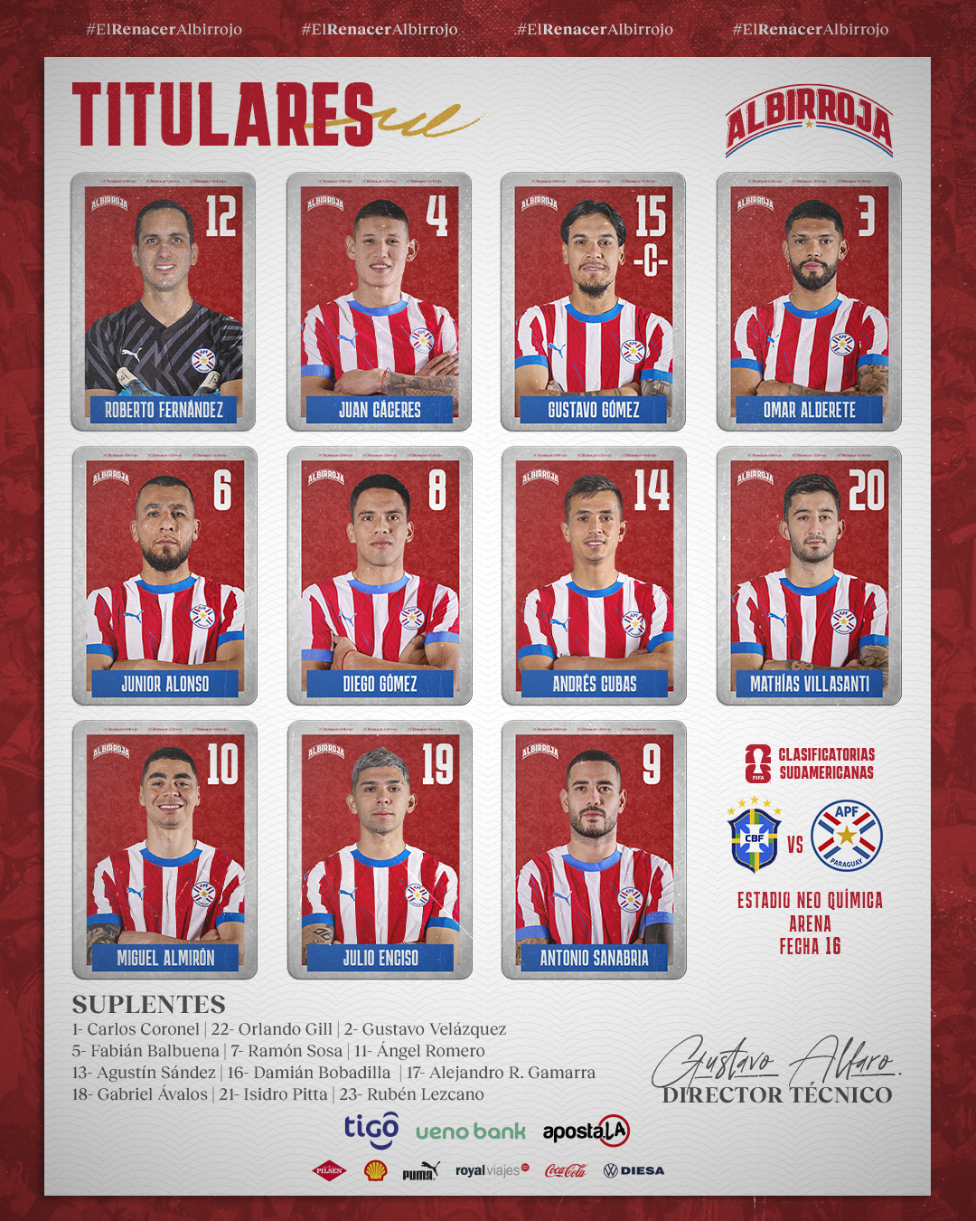 La escuadra albirroja, dirigida por el argentino Gustavo Alfaro, llega al compromiso en Sao Paulo en un gran momento deportivo. Paraguay es tercero en la tabla con 24 puntos y su clasificación al Mundial 2026 está prácticamente asegurada. En la fecha 15 derrotó como local por 2-0 a Uruguay con tantos de Matías Galarza y Julio Enciso.