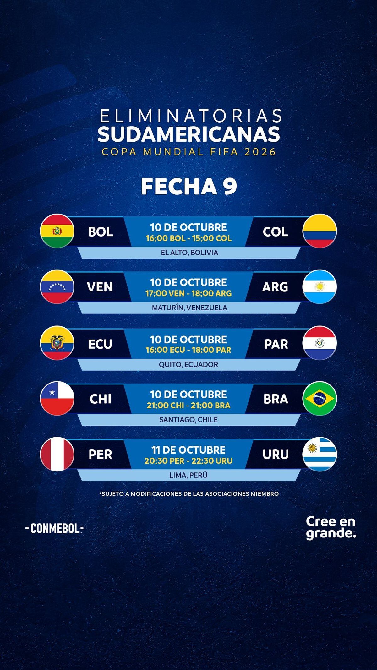 Con el regreso de Lionel Messi tras su ausencia por lesión en la doble fecha de setiembre, la campeona mundial Argentina visita a Venezuela en la novena jornada del clasificatorio sudamericano para el Mundial de 2026, en la que Brasil, con varias bajas por lesión, tiene un partido de riesgo en Santiago ante Chile.
