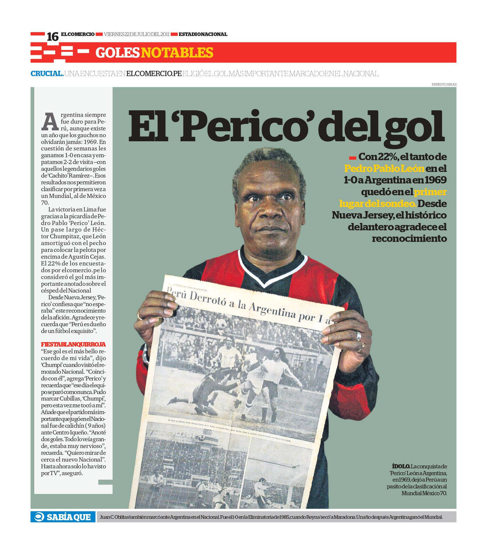 Se contaban los días para la reinauguración del nuevo Estadio Nacional. Era julio del 2011 y elcomecio.pe elaboró una encuesta para que los lectores eligieran el gol más importante que se había marcado en el tan querido estadio. Aún no llegaban los de Guerrero y Farfán que nos llevaron al Mundial luego de 36 años, por lo que el público eligió el tanto de ‘Perico’ León a Argentina en 1969 por las Eliminatorias.