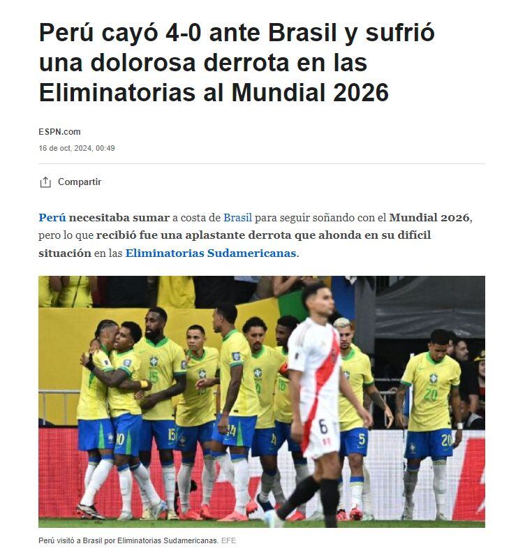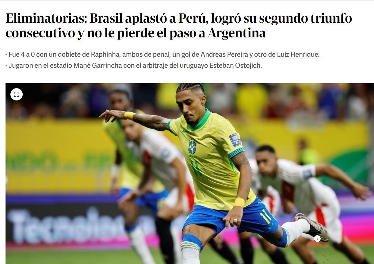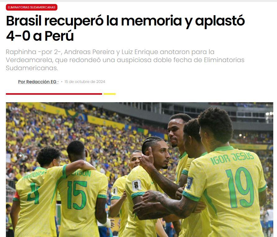 Al respecto, la prensa internacional destacó la gran actuación de Brasil ante una débil Perú en el Estadio Mané Garrincha.