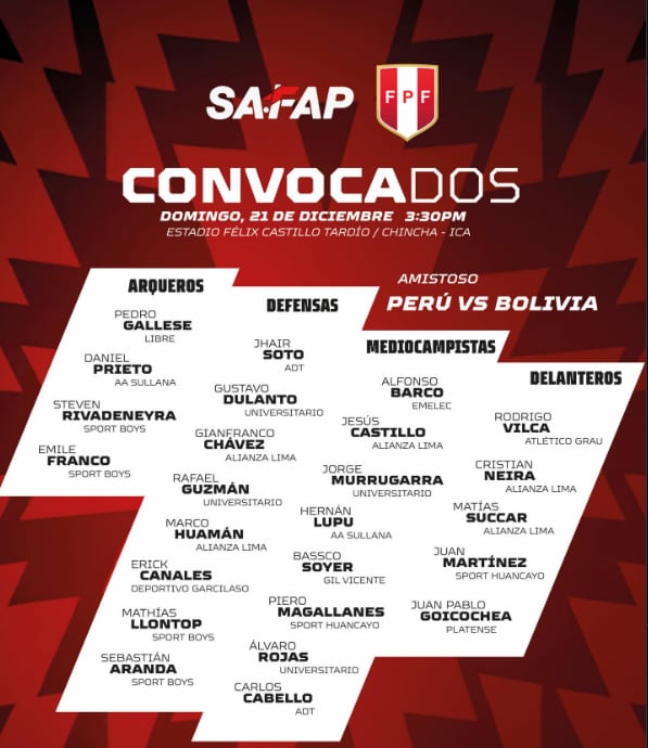 La Agremiación de Futbolistas Profesionales del Perú (SAFAP) anunció este domingo 14 de diciembre a los convocados peruanos para el duelo amistoso ante Bolivia.