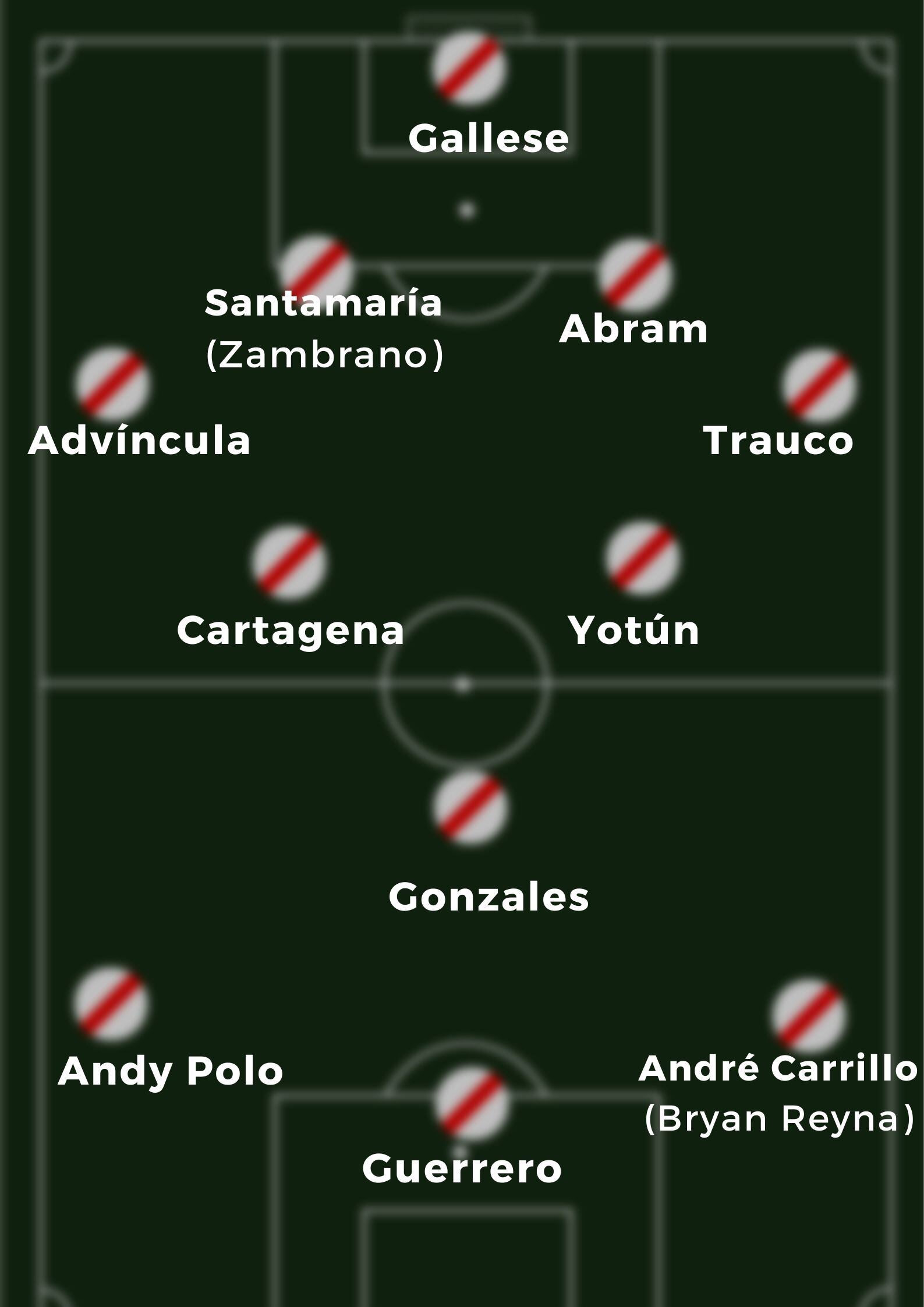Perú inició el encuentro con el siguiente once: Gallese, Advíncula, Ramos, Callens, Trauco, Aquino, Yotún, Peña, Cueva, Flores y Guerrero. De la oncena mencionada, al menos cinco jugadores se perfilan como titulares en la próxima visita a Santiago: Gallese, Advíncula, Trauco, Yotún y Guerrero. Todos ellos, titulares en sus clubes y en momentos importantes, destacando, sobre todo, el inmejorable momento de Guerrero, quien disputará la final de la Copa Sudamericana y también de Advíncula, quien hará lo propio con la final de la Libertadores. Peña es de los más regulares en su club y en la selección, siempre estuvo convocado y se mantiene a la espera de poder sumar sus primeros minutos en esta eliminatoria.