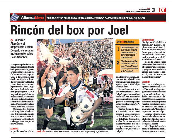 El otro gran tema que perjudicó a Alianza fue cuando ‘congelaron’ a Joel Sánchez. Sobre el final del 2010, el futbolista no quiso renovar su contrato, que finalizaba en diciembre del 2011, por lo que Alarcón, con la influencia de Fernando Alonso, representante de Gustavo Costas, decidió que el jugador no juegue más en el equipo.