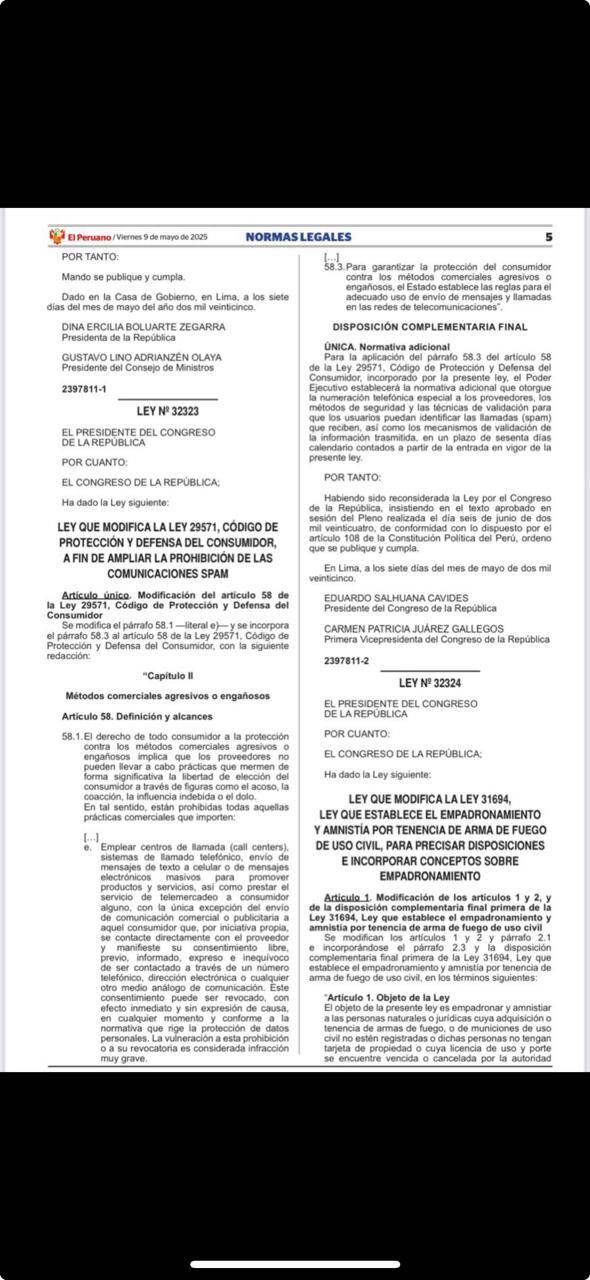 A través de una publicación en las normas legales del diario El Peruano, el Congreso oficializó la autógrafa de ley, aprobada por insistencia, que modifica el Código de Protección y Defensa del Consumidor a fin de ampliar la prohibición de las comunicaciones spam.