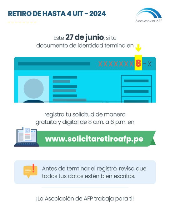 Si tu documento de identidad termina en 6, este martes 25 de junio podrás registrar tu solicitud de retiro de 8 a.m. a 6 p.m. en el siguiente ENLACE.