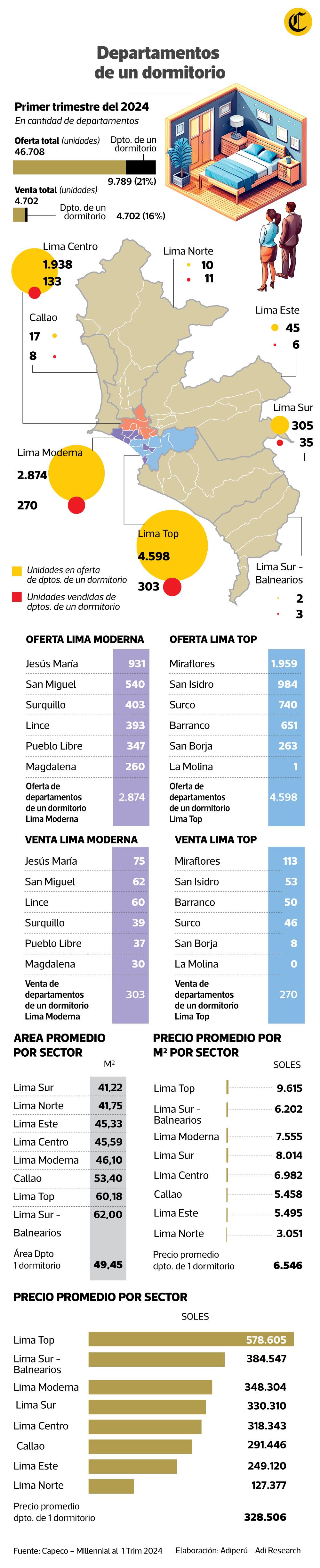 Germán Salazar, vocero de la Asociación de Desarrolladores Inmobiliarios (ADI), señala que el mercado inmobiliario cuenta con dos tipos de productos de departamentos de un dormitorio: los monoambientes, es decir, que en un mismo espacio conviven los ambientes de dormir y estar (sala y dormitorio) con áreas de entre 25 m2 y 32 m2. Y los de un dormitorio, departamentos que deben tener como mínimo un baño, una cocina o ‘kitchenette’, una sala comedor pequeña y un espacio para lavar ropa, todo en un espacio de entre los 35 m2 y los 42 m2.