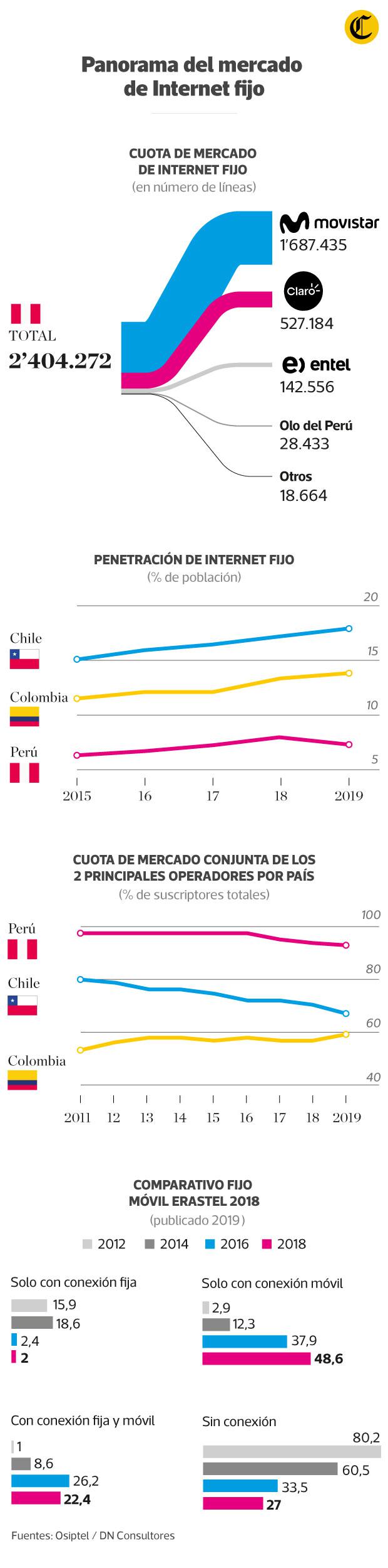Las diferencias con el Internet móvil son enormes. No solo llegan a diez veces más usuarios (24 millones de líneas) sino que Osiptel refiere tienen el doble de índice de concentración (5500 frente a 2722). Ahí Movistar es el líder, pero no supera el 37% de la torta. Es por eso que mientras el 48,6% de hogares acceden a Internet exclusivamente por una conexión móvil, solo el 2% lo hace en exclusiva con el fijo, añade Jiménez.