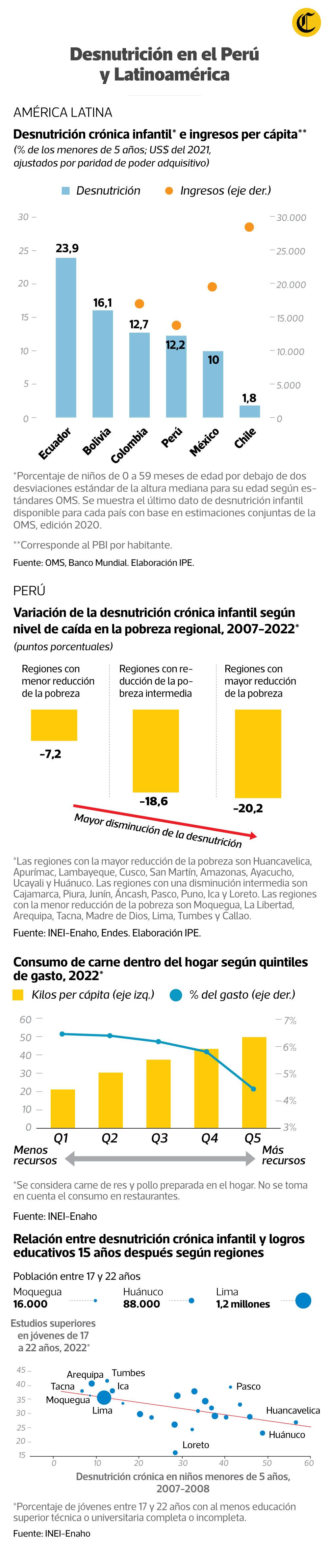 Los estudios indican que la desnutrición infantil puede afectar el desarrollo cognitivo y conductual, el rendimiento escolar, la salud y la productividad laboral. Por ejemplo, las regiones cuyos infantes enfrentaron una mayor tasa de desnutrición entre el 2007 y 2008 fueron, 15 años después, en 2022, las que contaron con un menor porcentaje de jóvenes que alcanzaron algún nivel de educación superior. En esa línea, un estudio del 2011 de Lorena Alcázar, investigadora principal de Grade, encontró que la desnutrición tenía un costo de S/11 mil millones debido a las pérdidas de productividad, educación y salud de las personas que sufrieron desnutrición en su infancia, un equivalente al 2.2% del PBI en ese año.