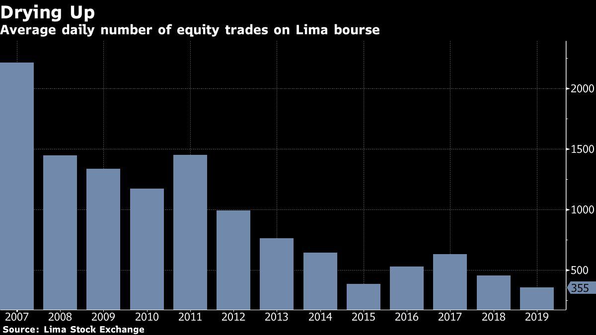 La operación de acciones en la Bolsa de Valores de Lima (BVL) ha caído 41% desde 2012 a US$3.600 millones el año pasado, una miseria en comparación con sus pares regionales como Colombia y Chile. Si bien la moneda y los mercados de bonos corporativos son algo más activos, también sufren una escasez de volumen.