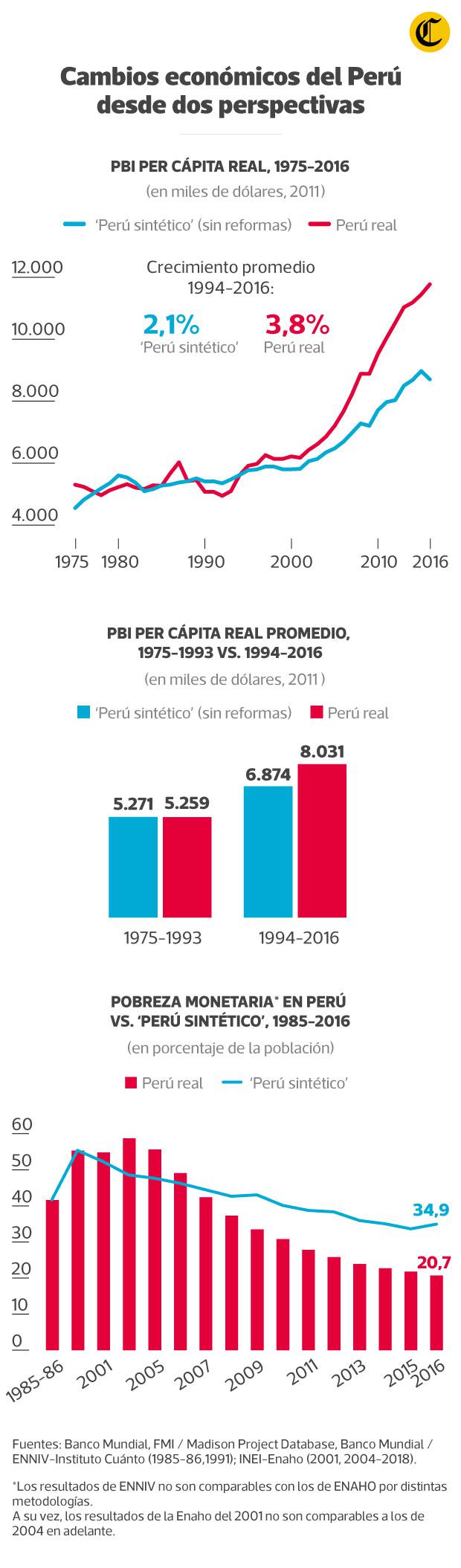 En este contexto, el Instituto Peruano de Economía (IPE) ha estimado un escenario alternativo, teórico, de crecimiento para el Perú en el cual las reformas estructurales de los noventa no se hubieran implementado. Los resultados apuntan a que el marco económico moderno ha permitido un mayor avance en términos de riqueza promedio de los peruanos y reducción de la pobreza monetaria del que se hubiera logrado si continuaba con el modelo económico previo.
