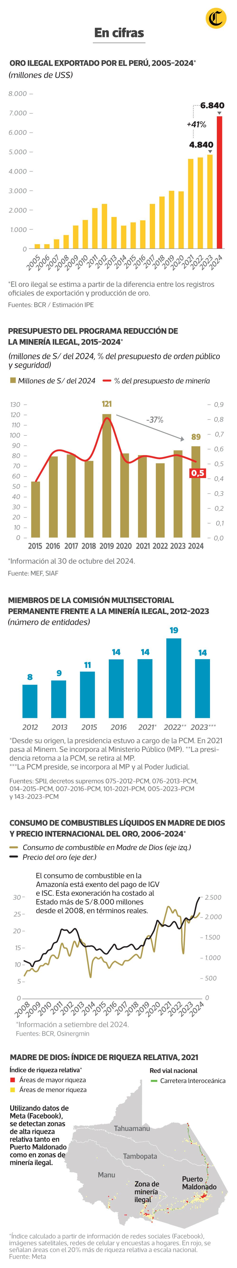 Los estragos de la minería ilegal abarcan varias dimensiones. Entre el 2015 y el 2021, el porcentaje de la población de 15 años a más víctimas de delitos con armas de fuego en Madre de Dios se multiplicó por cinco, de 7,5% a 38,6%, casi cuatro veces el promedio en el resto del Perú (10,9%). Además, entre el 2021 y el 2024, la deforestación por minería ilegal alcanzó casi 31 mil hectáreas, según estimados del Proyecto de Monitoreo del Amazonas Andino (MAAP).
