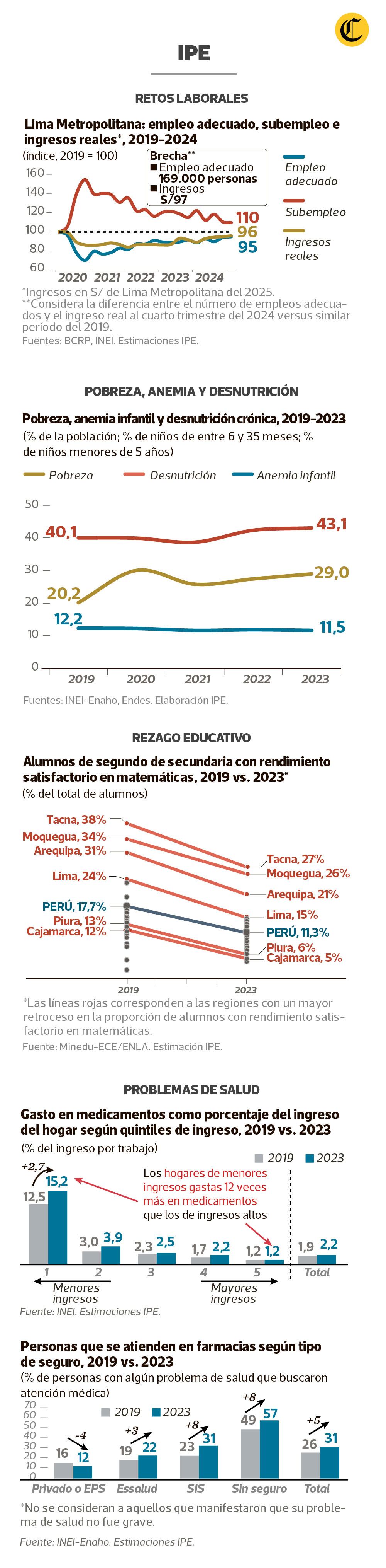 La pandemia, la crisis económica y el menor dinamismo de la inversión privada revirtieron el ritmo de reducción de la pobreza. En el 2023, 3,3 millones de personas que ingresaron a la pobreza en 2020 permanecen en esa condición. Esta situación afectó el consumo de alimentos nutritivos de las familias más vulnerables, elevando la anemia infantil de 40,1% a 43,1% entre 2019 y 2023. Aunque hubo una ligera reducción de la desnutrición crónica, esta se elevó en nueve regiones. Según el Banco Mundial, con un crecimiento de 3%, el país tardará dos décadas en retomar el nivel de pobreza de 2019.