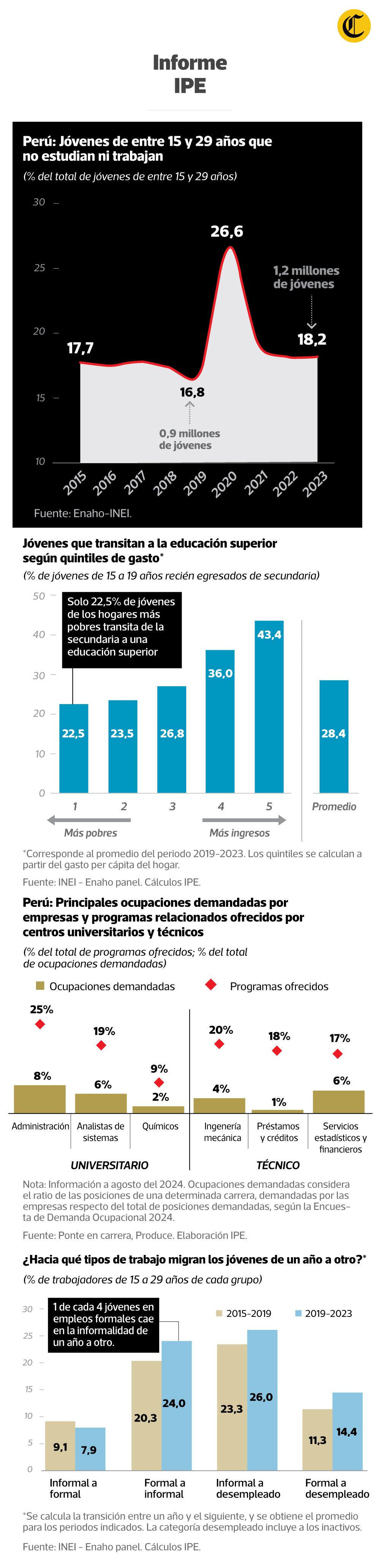 Uno de los factores que ha agravado esta situación es la dificultad para acceder a la educación superior. Durante la pandemia, según el Minedu la tasa de deserción en universidades privadas -donde estudian 3 de cada 4 estudiantes universitarios- se elevó de 4% en 2019 a 22% en 2020. Además, un bajo nivel de ingresos dificulta el tránsito de los jóvenes que culminan la educación secundaria hacia programas universitarios o técnicos. Así, mientras que más del 43% de los jóvenes entre 15 y 19 años de los hogares de mayores ingresos acceden a la educación superior, solo 23% de jóvenes en los hogares más pobres lo logran. Esto representa una barrera para competir en el mercado laboral.