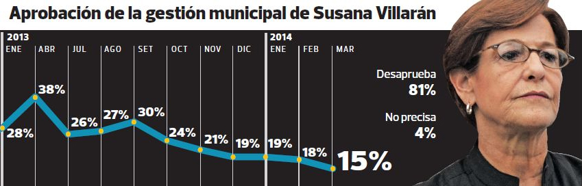 Según la más reciente encuesta de El Comercio, realizada por Ipsos Perú antes de la intervención final en La Parada, la popularidad de la alcaldesa de Lima, Susana Villarán, continúa en picada.