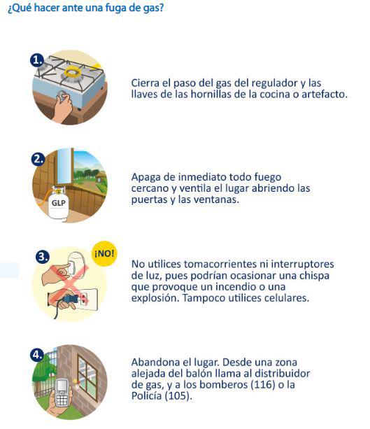 Casaretto recomendó a las personas a alejarse de sus viviendas o de donde se encuentren cuando sientan el olor a gas. Osinergmin recomienda, por su parte, evitar generar fuego alrededor y apagar de inmediato si hay alguno cerca. La chispa del encendido podría ocasionar un incendio o explosión. No se debe encender ni apagar la luz ni conectar o desconectar algún artefacto.