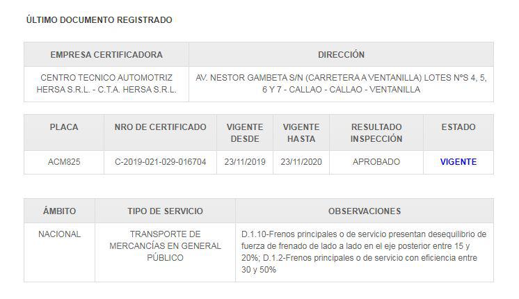 Según el portal del Ministerio de Transportes y Comunicaciones (MTC), el camión cuenta con la inspección técnica vehicular aprobada por el centro técnico automotriz Hersa S.R.L. (Ventanilla).