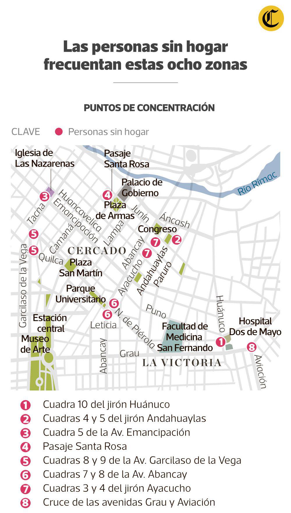 El constante movimiento de los peruanos que no tienen casa hace difícil empadronarlos –algunos ni siquiera figuran en el Reniec– o conocer su ubicación exacta, pero la Subgerencia de Bienestar y Promoción Social del municipio halló ocho puntos del Cercado donde se concentran.