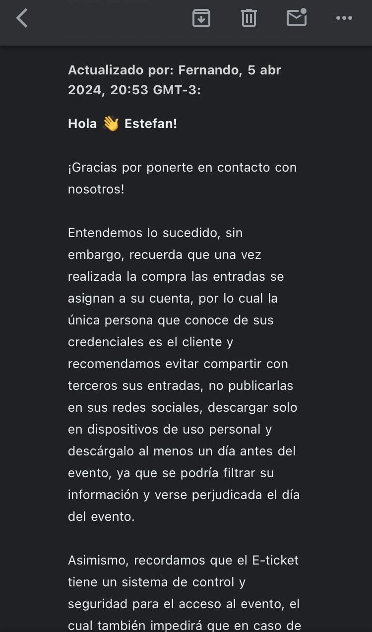 Agregó que no había a quién reclamar, ya que no se observaba ningún módulo de ayuda. “Al día siguiente presenté mi queja en Teleticket y solicité la devolución del dinero. No había compartido absolutamente con nadie las entradas. La respuesta fue que cada comprador era responsable de su código“, mencionó.