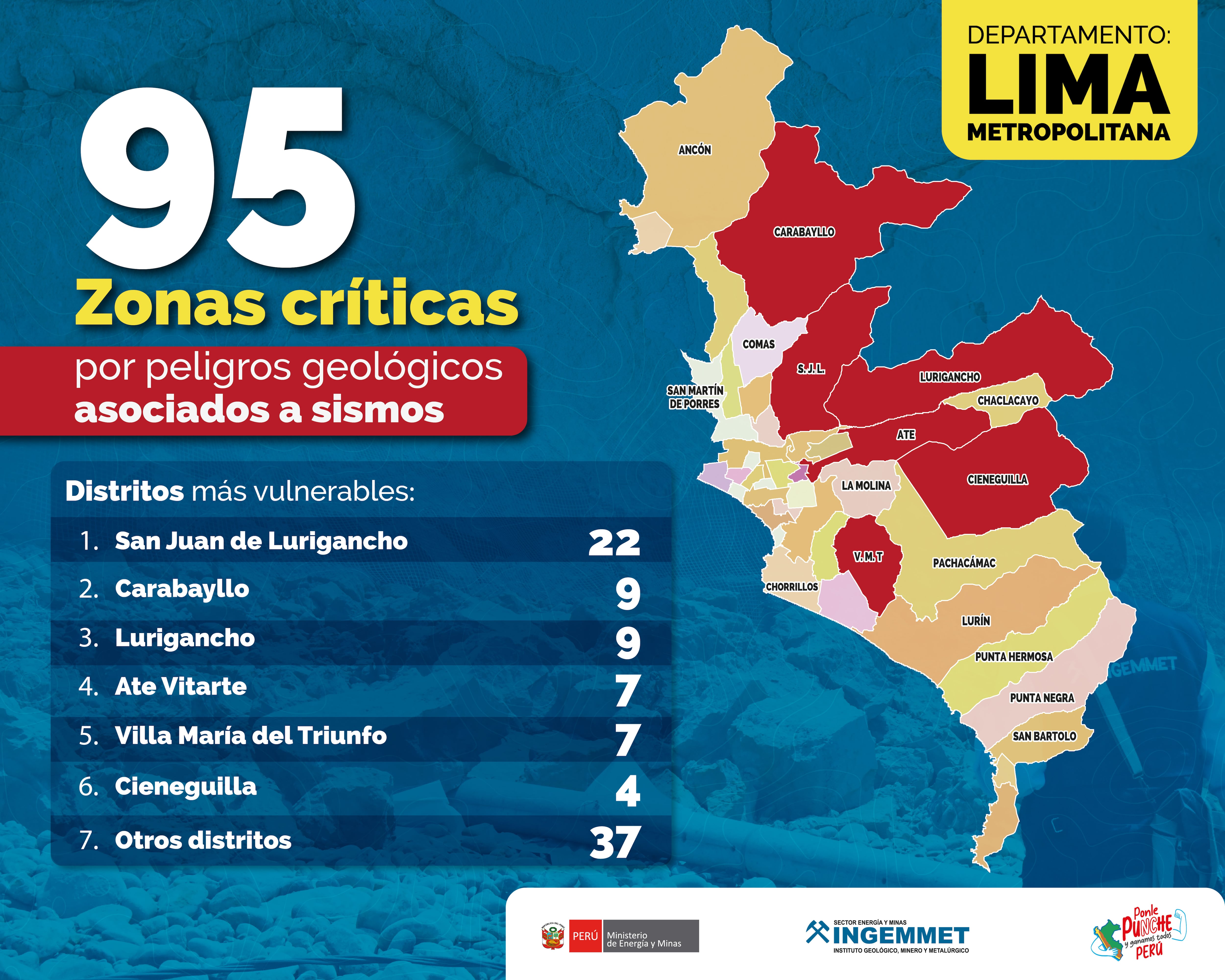 El Instituto Geológico, Minero y Metalúrgico (Ingemmet) identificó un total de 95 zonas críticas en Lima Metropolitana y el Callao que presentan alta vulnerabilidad ante la ocurrencia de sismos. Estas áreas concentran 891 peligros geológicos activos, entre ellos deslizamientos, caída de rocas, derrumbes y vuelcos, que podrían intensificarse por la actividad sísmica.