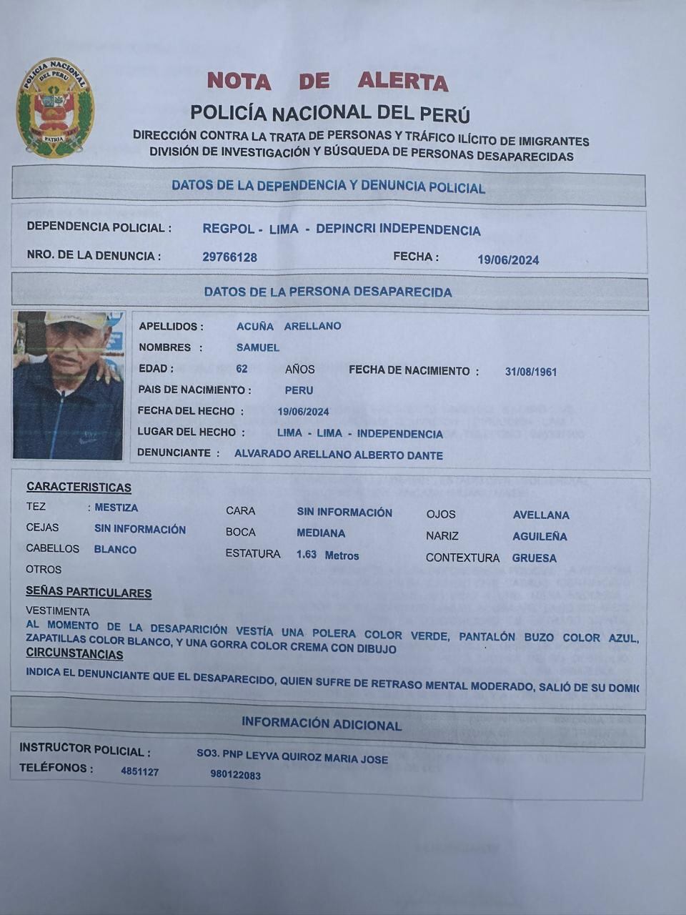 Un hombre de 62 años, identificado como Samuel Acuña Arellano, fue reportado como desaparecido. La última vez que fue visto fue el pasado miércoles 19 de junio, cerca del Centro Comercial Plaza Norte, en la urbanización Mesa Redonda, entre el jirón progreso y la avenida Panamericana Norte, jurisdicción de Independencia.